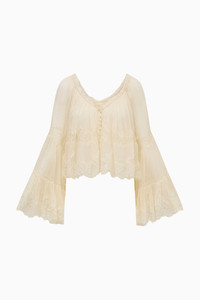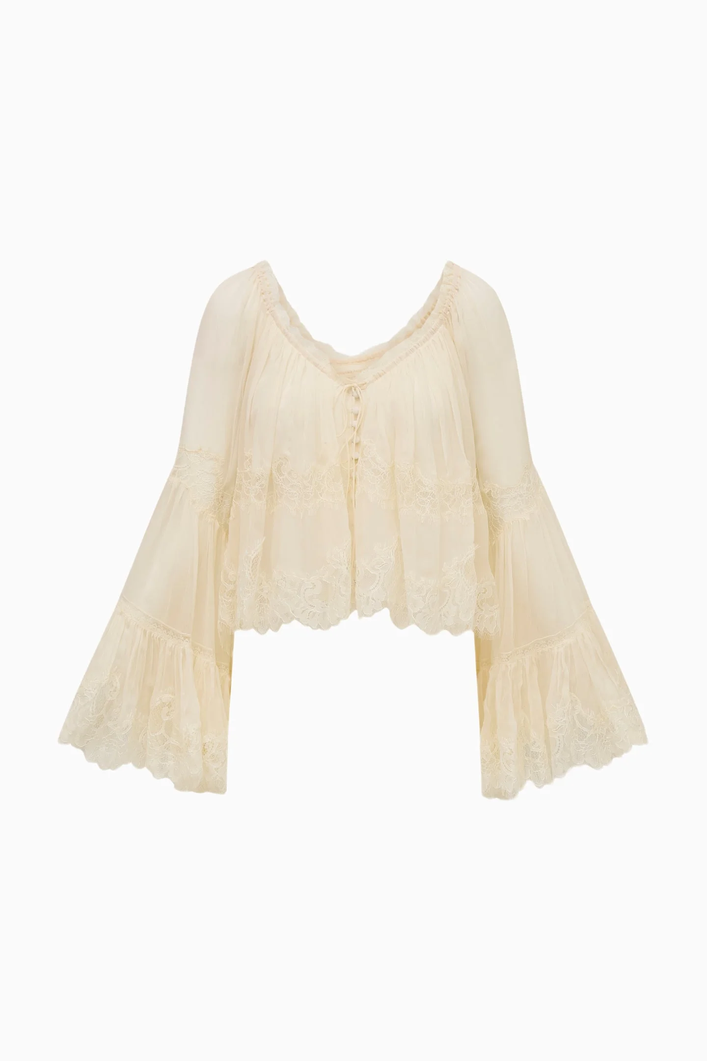 The Daline Top is a flowy, bohemian blouse crafted from lightweight silk chiffon. Designed with a trapeze silhouette that hits below the natural waist, it features an open neckline with elastic at the shoulders and bell sleeves that release into ruffled, romantic detail. The front buttons up with delicate self-covered loop buttons and includes a soft tie for a feminine finish. Details: - 100% Silk - Trapeze silhouette hitting below natural waist - Bell sleeves with elastic at shoulder and ruffle detail - Front button closure with self-covered loop buttons - Delicate tie at neckline - Lightweight, flowing chiffon for warm-weather elegance DETAILS - 100% Silk - Lining: 100% Polyester - Dry Clean Only SIZE & FIT Measurements based on Size S: - Length: 20¼″ - Bust: 37″ - Sweep Circumference: 86″ - Sleeve Length: 26½″