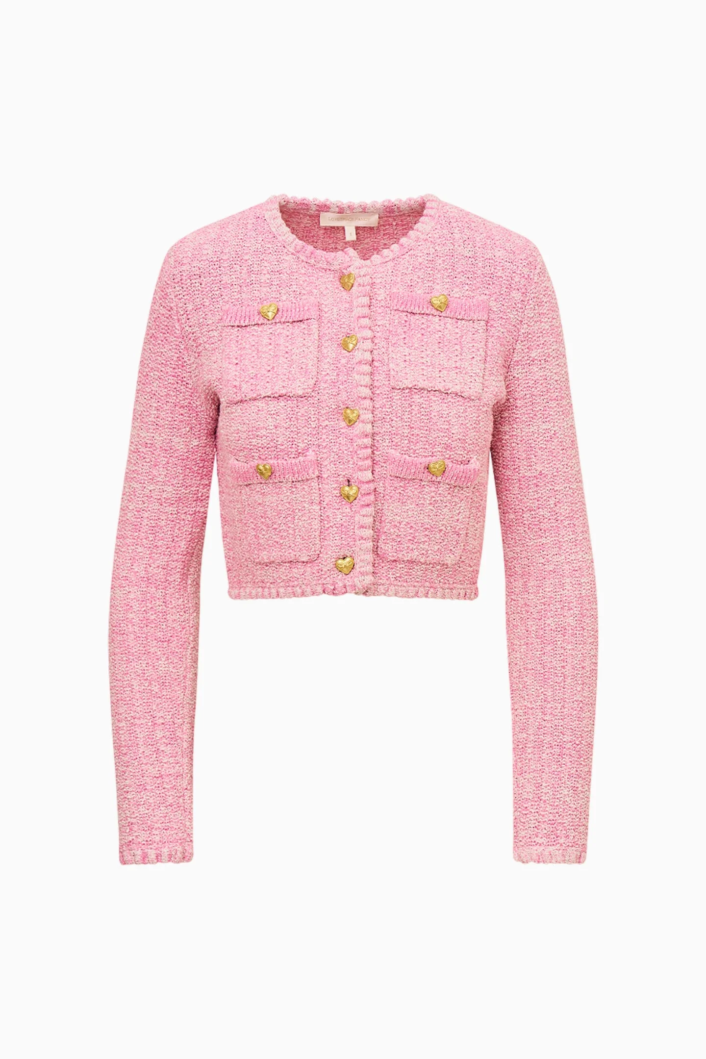 The Delcie Cardigan arrives for the fall. with Knit in a textured tweed stitch with a soft melange of white-and-pink cotton yarn with lurex shimmer. Structured with subtle shoulder pads, this polished yet playful layer is finished with custom heart buttons, functional pockets, and a sweet bobbly trim along the body and sleeve edges. Romantic and timeless, Delcie is a forever favorite to style on its own or paired back to the matching skirt, Ellianna Skirt. - Includes shoulder pads - Functional buttons down center front - Includes functional pockets DETAILS - 95% Cotton, 3% Polyester, 2% Metallic - Dry Clean Only SIZE & FIT Measurements based on Size S: - Length: 18 1/4" - Bust: 17 1/2" - Shoulder Width: 14" - Sleeve Length from Center Back Neck:29"