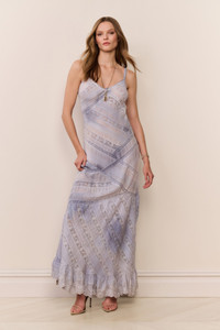 Designed with a sweetheart neckline and delicate spaghetti straps, the Eirene Slip Dress is an easy, feminine maxi with a softly fitted silhouette and flowing drape. A two-tone pattern, diagonal lace insets, and bias-cut panels add subtle movement, while a ruffled hem and lace trim finish the look with a romantic, boho feel. Details: - Spaghetti straps - Sweetheart neckline - Ruffle hem with lace trim DETAILS - 100% COTTON - HAND WASH - IN COLD WATER - DO NOT BLEACH - LAY FLAT TO DRY - LOW IRON SIZE & FIT Measurements based on Size 4: - Model Height: 5'10" - Length: 57 1/2" - Bust: 32 1/2" - Waist: 30" - High Hip: 35" - Low Hip: 41 1/4"
