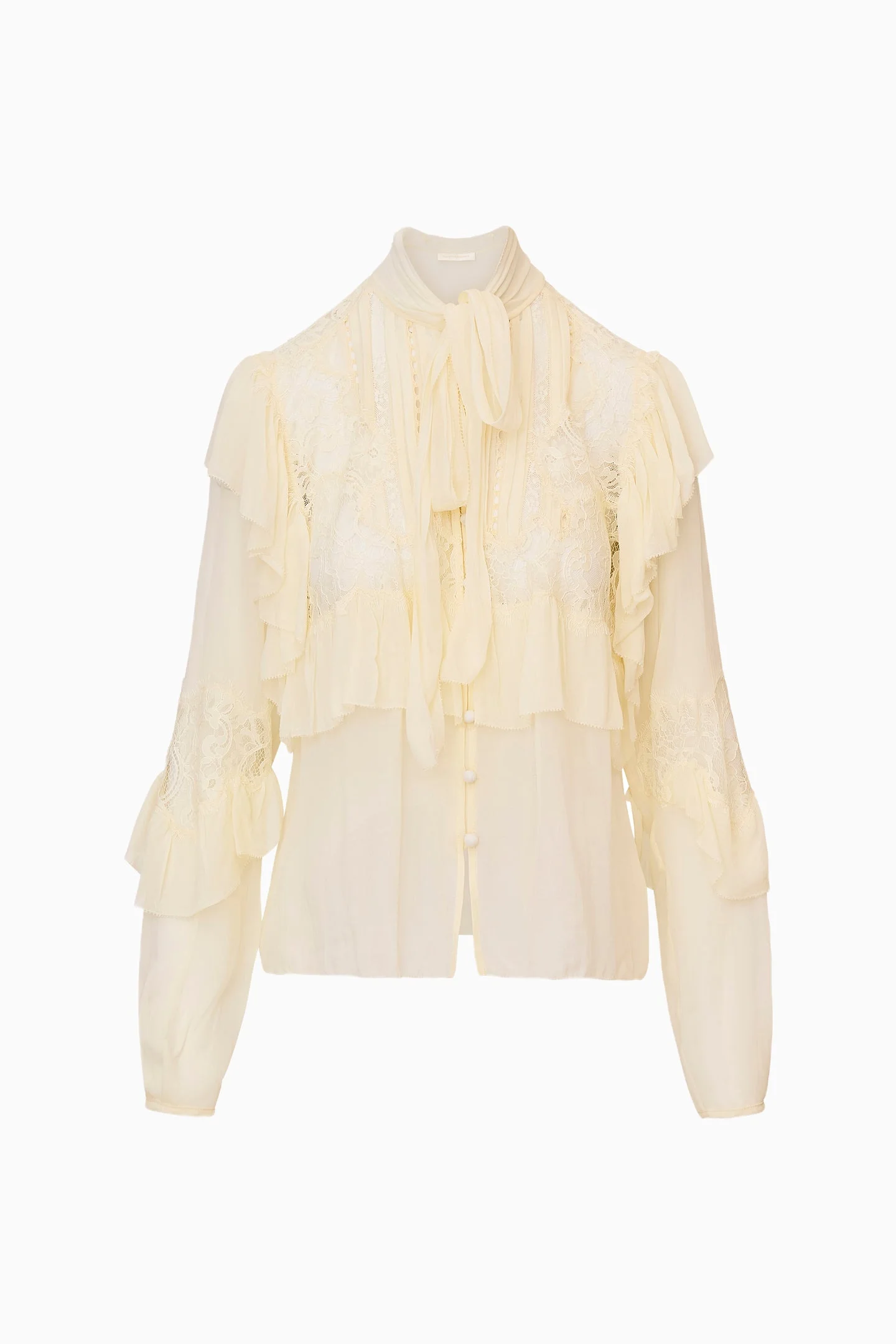 The Farah Top is a study in Bohemian-inspired romance, cut in airy viscose georgette with a cascade of ruffles that feel undeniably dreamy. This button-down blouse features a delicate loop closure at the front and a dramatic sleeve, where ruffles tumble from the shoulder to the elbow in signature LoveShackFancy fashion. A sheer lace yoke opens at the neckline for a sultry touch—perfectly wearable with a bra beneath—while a built-in bow sash can be tied at the front for a sweet finish or left undone for a flirtier edge. Lightweight and unlined, Farah is the ultimate bohemian blouse, equally chic tucked into denim or dressed up for evening. - 100% Viscose - Button-down blouse with loop closure at front - Sheer lace yoke with open neckline - Built-in bow sash—wear tied or undone - Unlined, sheer and lightweight DETAILS - 100% Viscose - Dry Clean Only SIZE & FIT Measurements based on Size S: - Length: 23 1/2" - Bust: 43" - Sweep: 46" - Sleeve Length: 25"