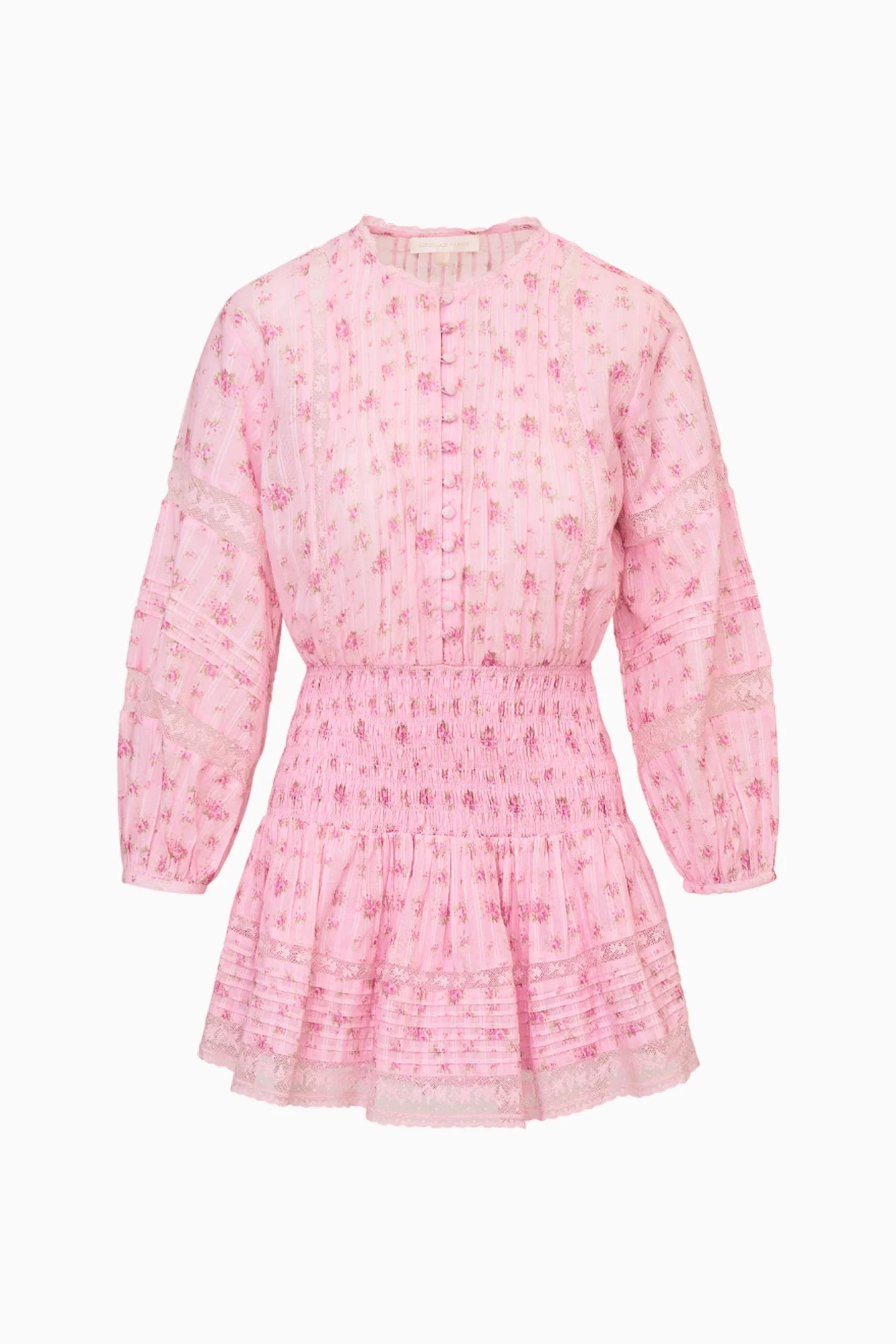 Pretty in pink for the fall season with the Janis Dress. This charming frock debuts with a striped cotton dobby fabric giving this piece an intricate texture featuring an ikat tossed floral print. With a Victorian-inspired button down cotton mini arrives with an easy top with buttons descending down center front to the waist, 3/4 length sleeves, and elastication for easy pull on. The waist has smocking that then falls to an airy skirt. - 100% Cotton - Button up - Smocking at waistband DETAILS - 100% Cotton - Dry Clean or Hand Wash in Cold Water - Do Not Bleach - Lay Flat to Dry - Low Iron SIZE & FIT Measurements based on Size S: - Length: 23 1/2" - Bust: 43" - Waist (Relaxed): 25" - Sleeve Length from Shoulder Seam: 25"
