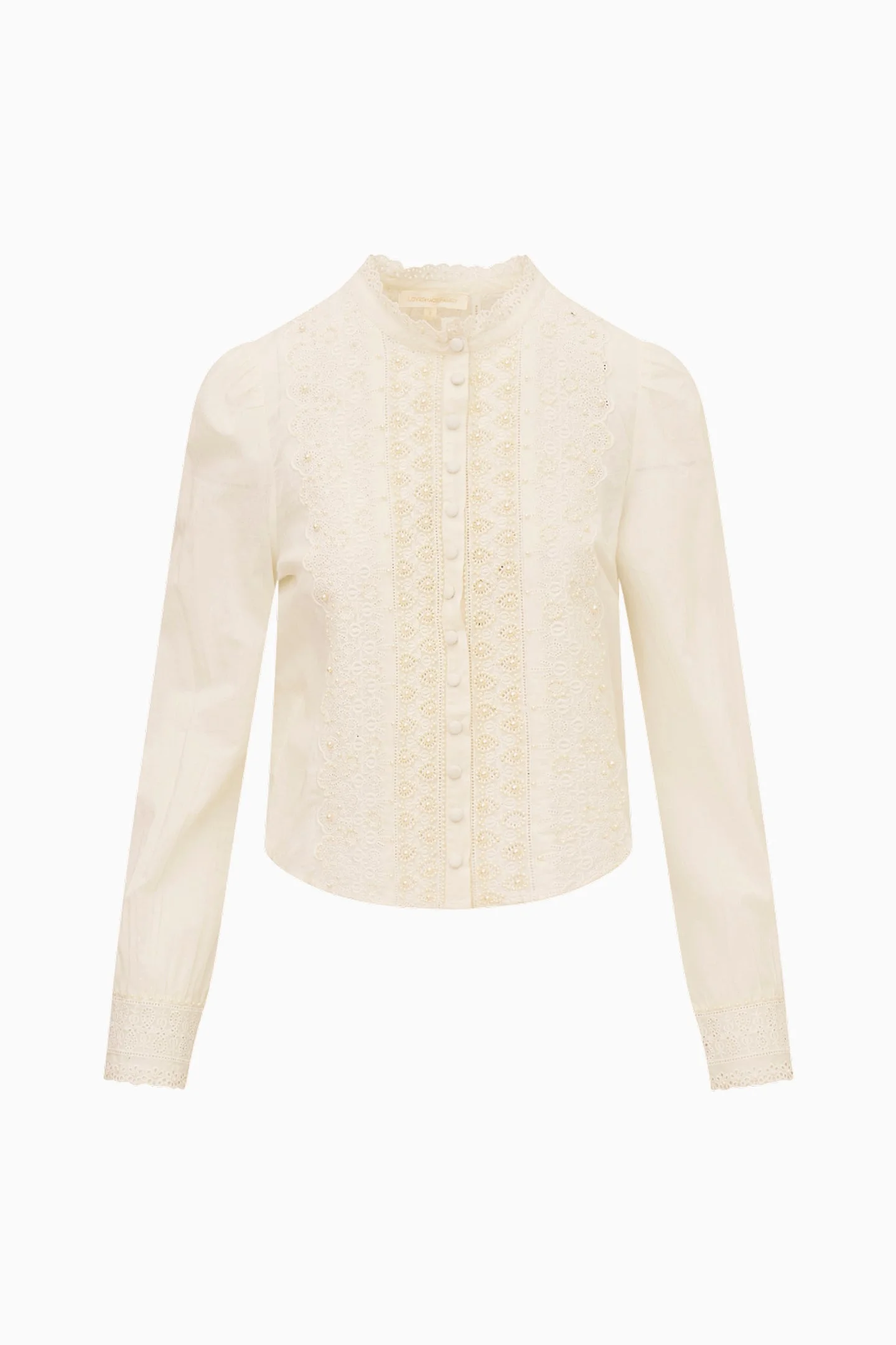 The Larine Top reimagines a classic button-down in airy organic cotton voile. Designed in soft off-white, this straight long-sleeve silhouette is adorned with delicate eyelet detailing, traced with dainty pearls along the front placket and collar. Faux self-covered snap buttons make it effortless to slip on and off, while keeping its romantic, vintage-inspired charm. Pair with the Ruffle Mini Skirt for the full set. - 100% Organic Cotton - Self-covered snap buttons DETAILS - 100% Cotton - Dry Clean Only/li> SIZE & FIT Measurements based on Size S: - Length: 22 1/4" - Bust: 40" - Sleeve Length from Shoulder Seam: 25"
