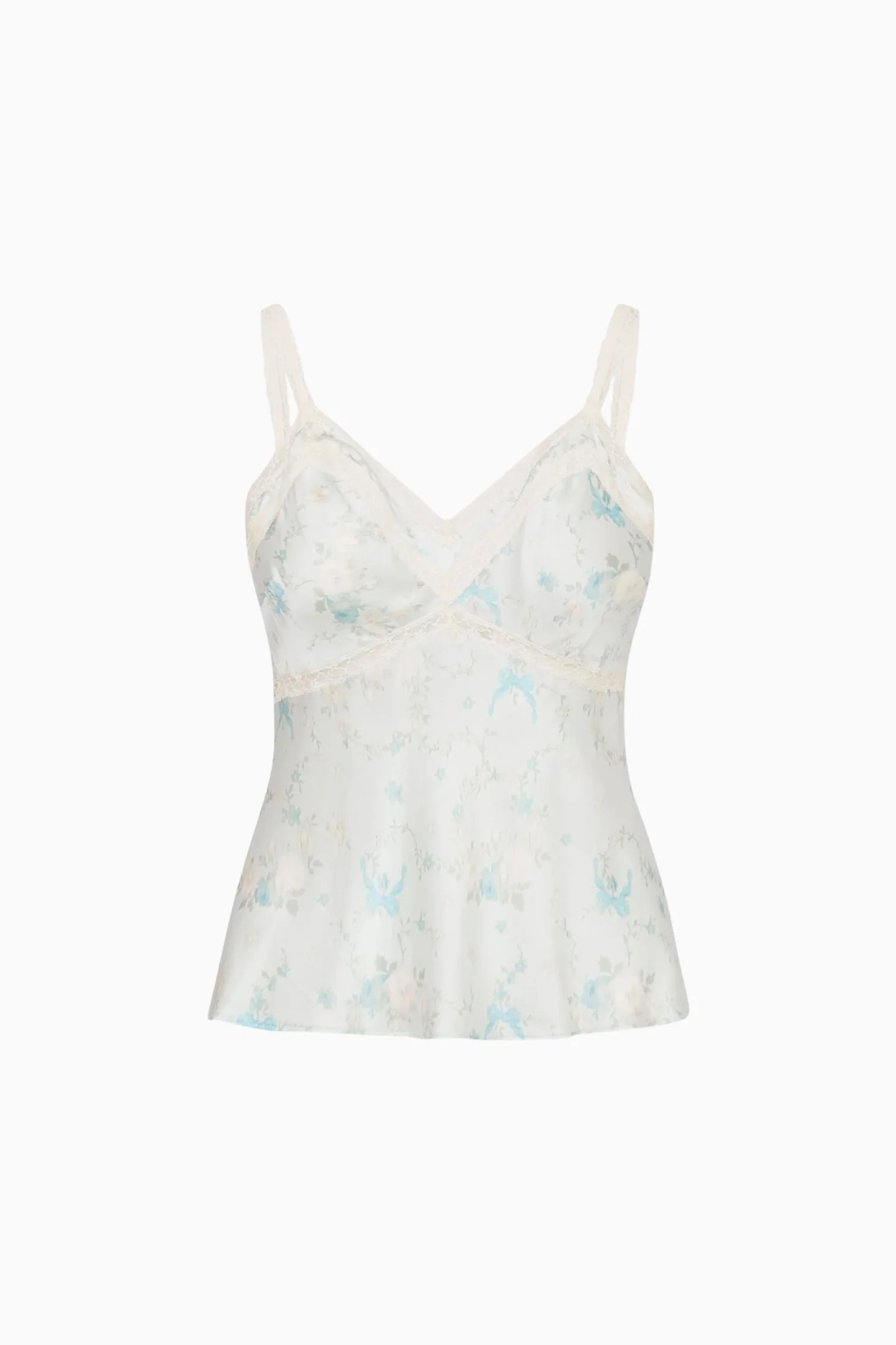 The Lirena Top is a bias-cut cami designed from our custom satin jacquard. Featuring an empire seam and delicate lace straps, it’s easy to pull on and showcases lace detailing throughout. Pairs beautifully with the Kalo Skirt for a full set. Details: - 60% Viscose, 40% Silk - Bias-cut cami top with empire seam - Easy pull-on styling - Lace straps and lace detailing throughout DETAILS - Shell: 60% Viscose - 40% Silk - Combo: 100% Polyester - Dry Clean Only SIZE & FIT Measurements based on size S: - Length: 17" - Bust: 35" - Empire waist: 31 1/2" - Sweep: 42" - Strap length: 11"