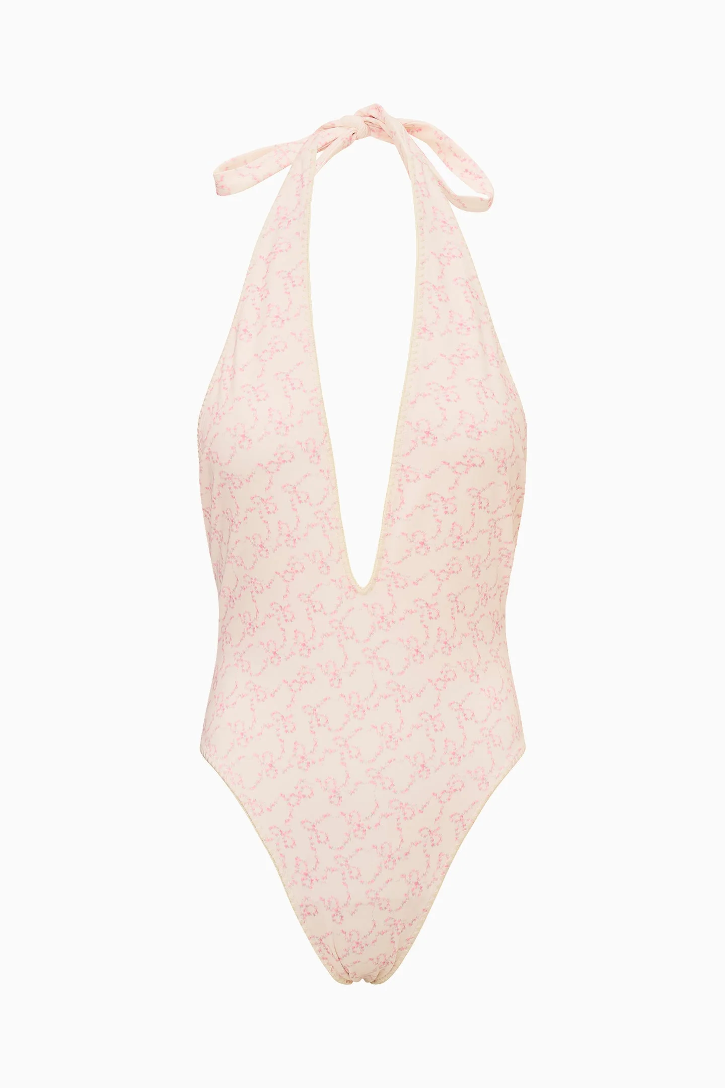 Introducing the Meegan Swimsuit. This flirty one-piece debuts with a pretty new print. The swimsuit has a self-tie detail around the beck, embroidery stitching around the neck and arm holes, coverage at the back, and a sexy, plunging neckline. - 85% Polyester, 15% Spandex - Self-tie - Coverage at back - Deep V-neckline DETAILS - 85% Polyester, 15% Spandex - Machine wash in cold water with similar colors - Low tumble dry SIZE & FIT Measurements based on Size S: - Bust Panel Width: 4" - Bust Width: 11 3/4" - Waist Width: 11 1/4" - Hip Width: 12 7/8" - Side Length: 7"