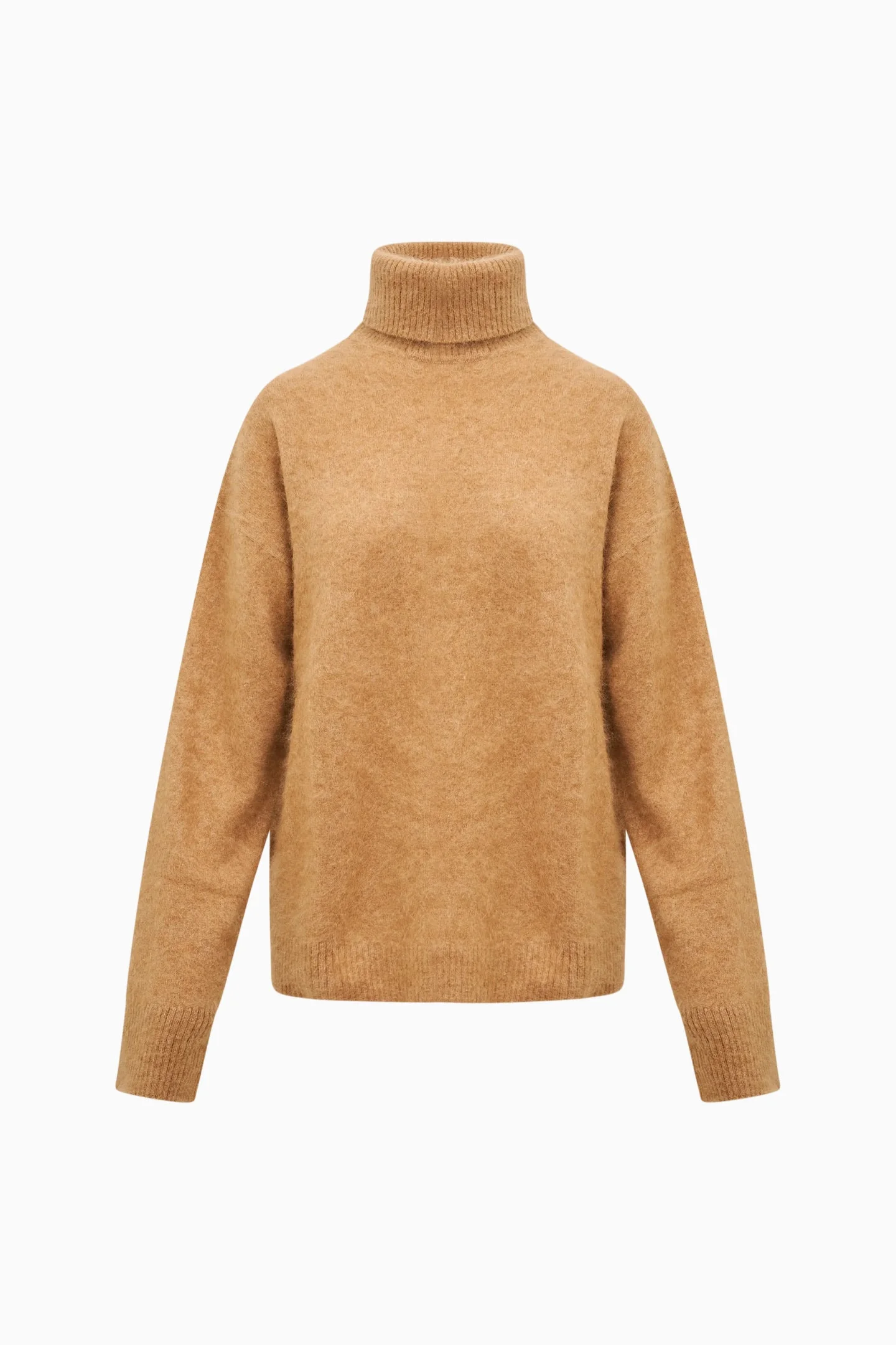 The Nia Turtleneck is the ultimate cozy-chic essential. Designed from a warm brushed cashmere, it’s luxuriously soft with a lightly fluffy texture. With a longer, oversized fit, the classic ribbed turtleneck, cuffs, and hem add structure while maintaining a relaxed, effortless silhouette. - 100% Cashmere - Oversized, relaxed fit DETAILS - 100% Cashmere - Dry Clean Only SIZE & FIT Measurements based on Size S: - Front Length: 27" - Back Length: 26 3/4" - Bust: 21 1/2" - Sweep: 20" - Sleeve Length: 31 3/4"