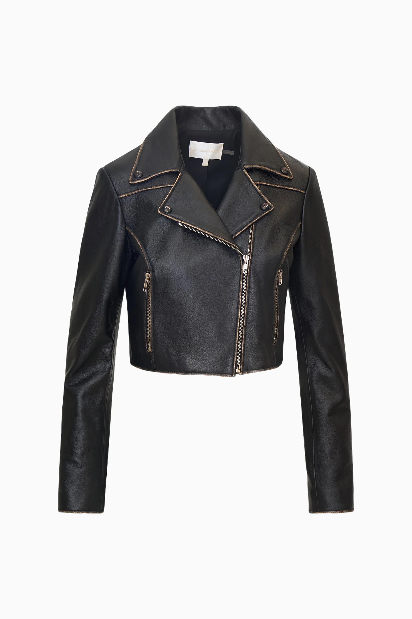 The Nyssara Jacket reimagines the classic moto with a feminine edge. Crafted in 100% lamb leather, this cropped, fitted silhouette comes in a deep, dark brown—distressed by hand for a warm, vintage patina. Designed with a sharp collar and lapel, princess seams with shining zippers, and slim sleeves, this biker-inspired piece balances toughness with timeless charm. Distressed detailing at the edges lends a lived-in finish. - 100% Lamb leather - Cropped - Distressed colorway - Collar and lapel with princess seam zippers - Side zip pocket - Slim sleeves DETAILS - 100% Lamb Leather - Professional Clean By Leather Specialist Only SIZE & FIT Measurements based on Size S: - Garment Length: 18 3/4" - Bust: 37 1/2" - Shoulder Length: 15 1/4" - Sleeve Length: 25"