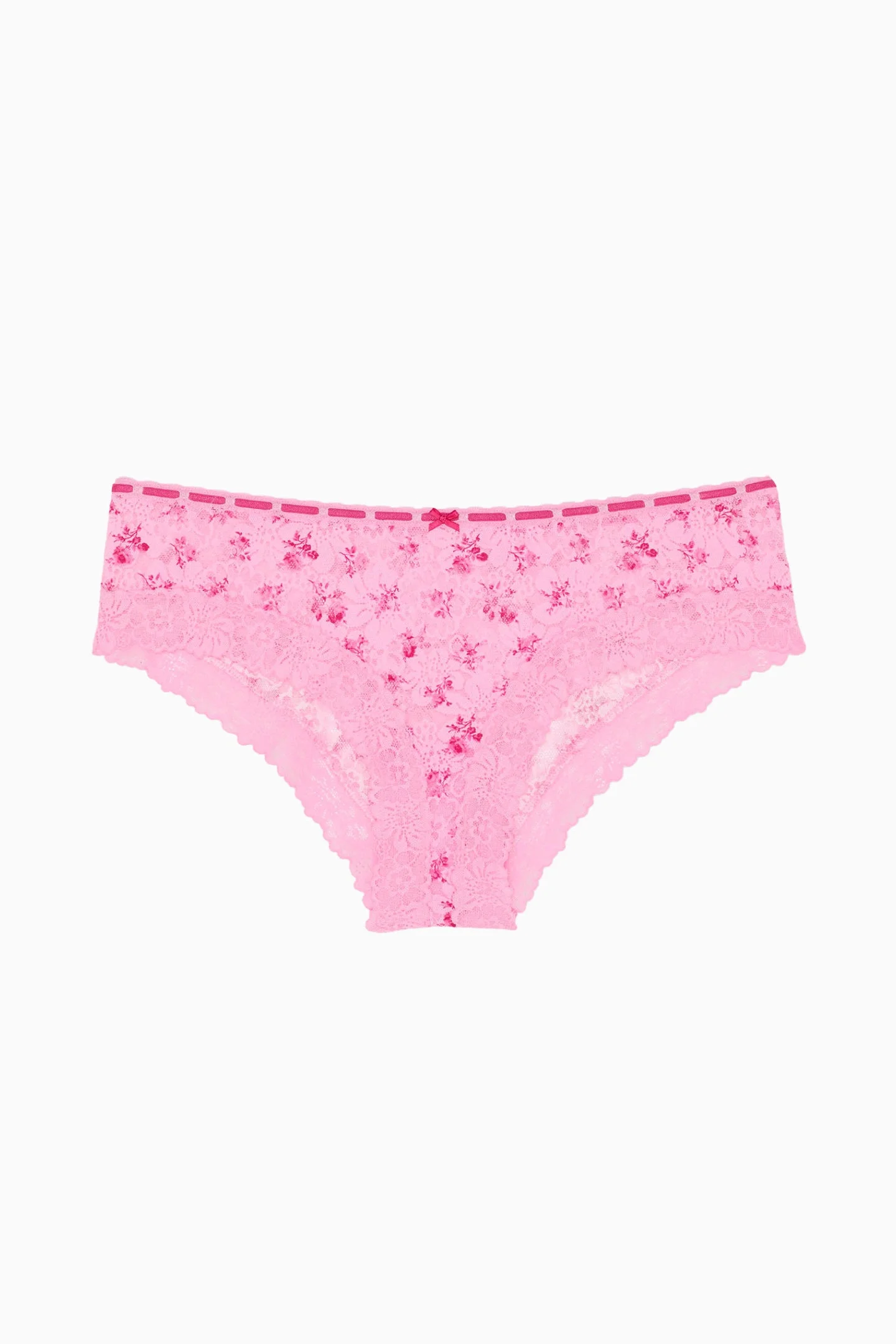 Feeling floral and flirty with this Floral Cheeky Pants from the exclusive, limited-edition PINK x LoveShackFancy collaboration. These undies feature a soft, printed lace and finished with a sweet, slotted ribbon trim. They have just the right amount of coverage and all of the flirty details. Pairs perfectly with the Push-Up Balconette Bra. - Super soft printed lace with ForeverStretch technology - Slotted ribbon trim with bow accent - Contrasting lace trims at waist and leg - 100% cotton gusset - Moderate back coverage: shows a little, but not all - Imported DETAILS - Body: 56% Recycled Polyamide, 29% Polyamide, 15% Elastane - Lace: 62% Recycled Polyamide, 23% Polyamide 15% Elastane - Gusset: 100% Cotton