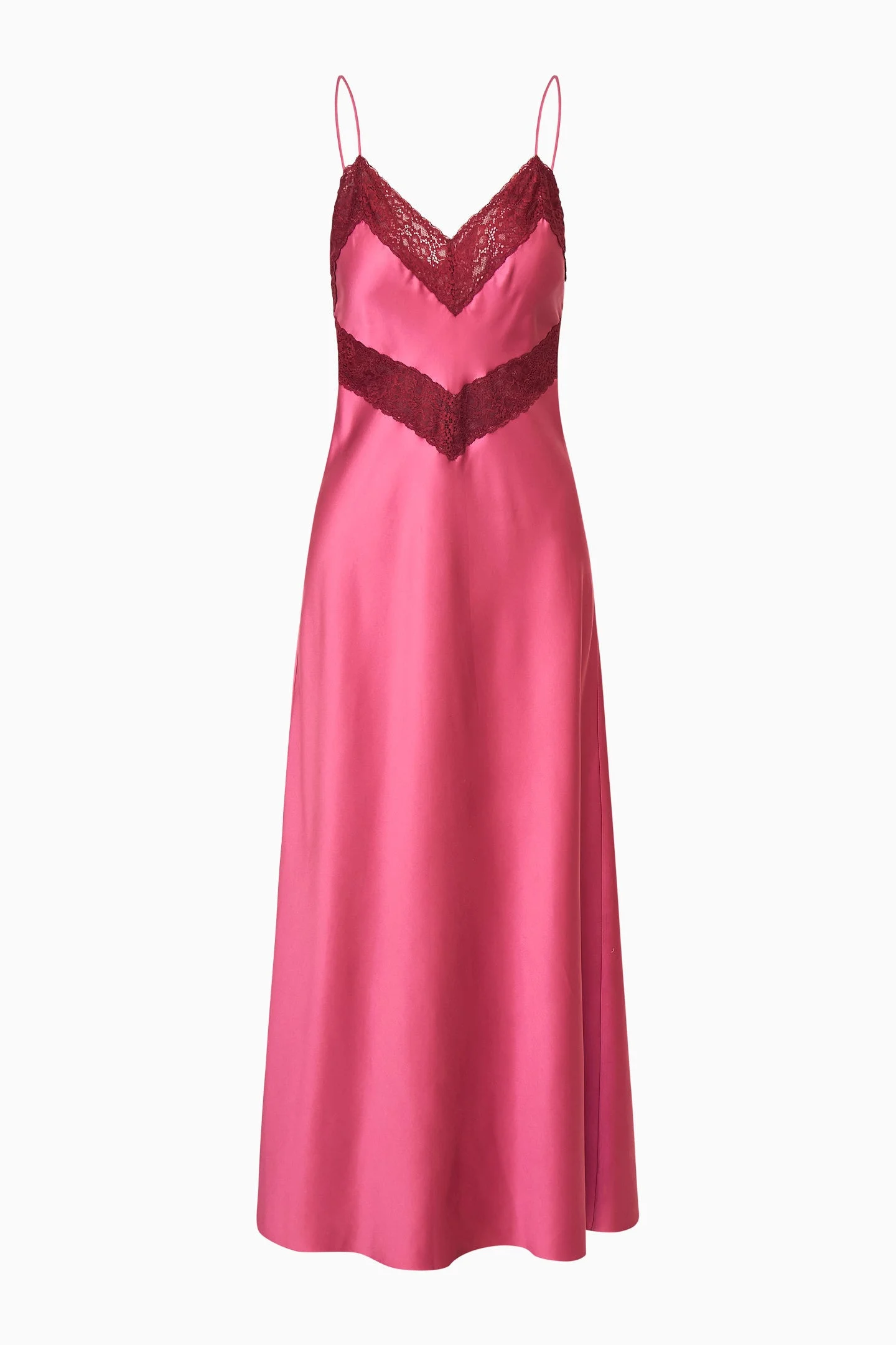 Everyone’s favorite Serita Dress is back and flirtier than ever. This time, she arrives in a medium weight silk charmeuse fabric giving this piece a drapey, yet elevated wear. The stunning slip dress features gorgeous contrasting lace at the neckline and waist giving this piece a feminine silhouette. The lace is backed with a bit of chiffon for a sexy finish. - 100% Silk - Bias cut - Spaghetti straps DETAILS - Shell: 100% Silk - Lace Trim: 100% Polyester - Dry Clean Only SIZE & FIT Measurements based on Size S: - Front Length: 56 1/4" - Bust: 32" - Waist: 29 1/4" - Strap Length: 10 1/4"