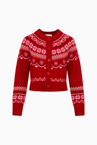 Our cozy Shantae Cardigan arrives in a festive colorway. The pretty knit is a charming Nordic-inspired piece featuring a faux Fair Isle pattern with our signature bow design throughout. Pair with a Ruffle Mini Skirt or your favorite vintage denim for a full look. Match your look to your little love with the Wrenna Cardigan. Plus, we made one for your furry friend too, check out the Arindia Dog Sweater. - 100% extra fine merino wool - Raglan seams give this piece a relaxed fit - Custom LoveShackFancy faux shell buttons DETAILS - 100% Wool - Dry Clean Only SIZE & FIT Measurements based on Size S: - Length: 19" - Bust: 18" - Sweep: 1" - Sleeve Length: 30"