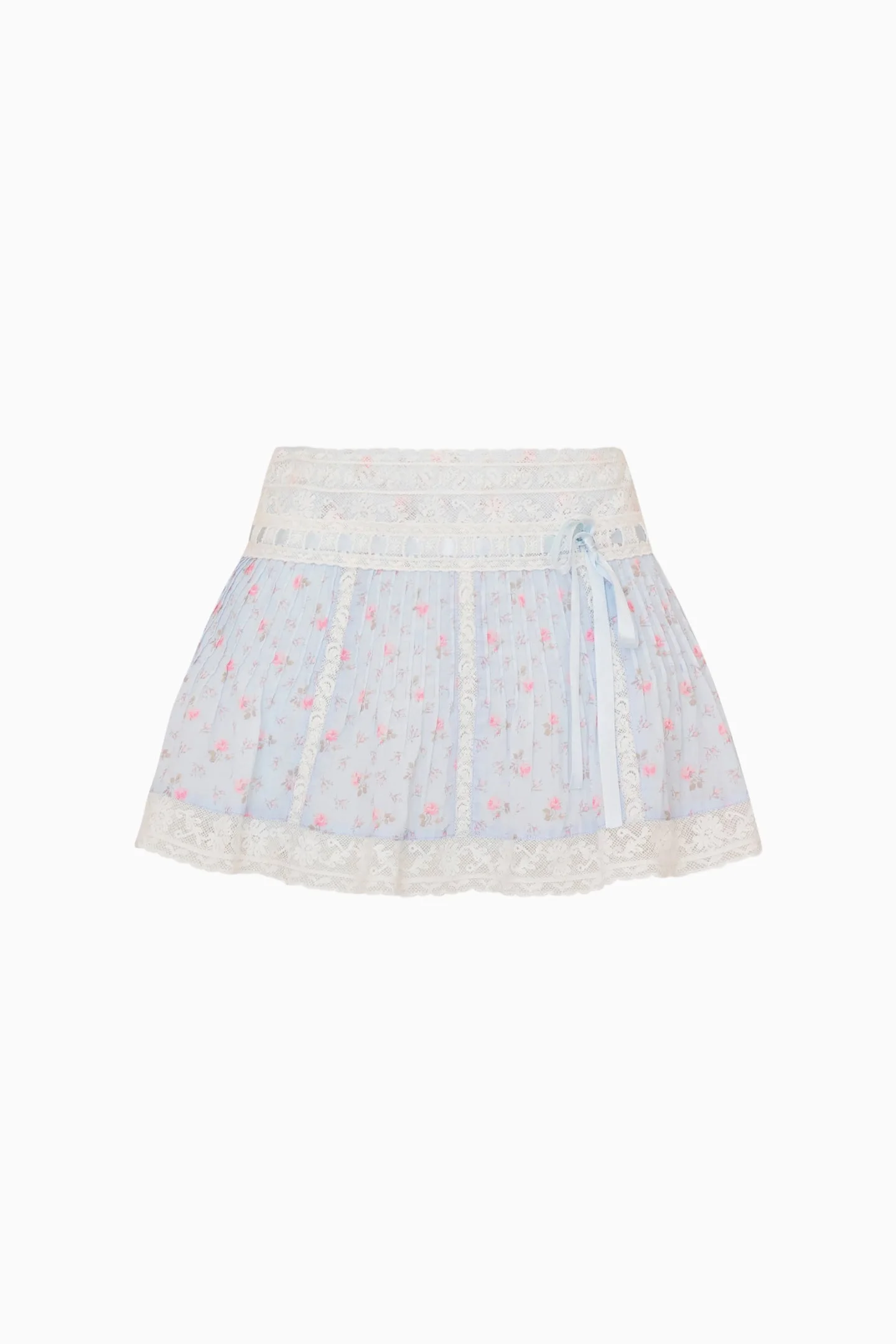 The Solena Skirt is crafted in soft pale blue with sheer layers and embroidered lace. A ditsy rosebud print and vertical lace panels add detail, while a side ribbon tie and lace-trimmed hem create light, fluid movement. Details: - Pleated mini silhouette - Sheer layers with embroidered lace - Vertical lace panels - Side ribbon tie detail - Floral lace trim at hem DETAILS - 100% COTTON - HAND WASH IN COLD WATER - DO NOT BLEACH - LAY FLAT TO DRY - LOW IRON SIZE & FIT Measurements based on Size 4: - Waist: 30 1/2" - Length: 14 1/2" - Sweep: 73" - Lining Length: 11"