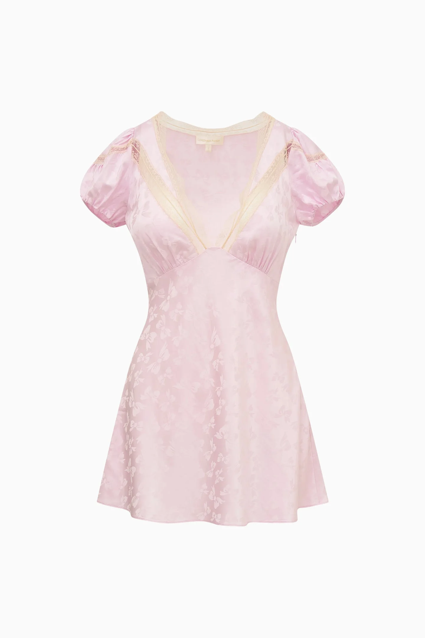 Designed in our custom satin jacquard, the Sylara Dress is a flirty, bias-cut mini with an empire waist and soft shirring at the bust. Lace striping traces the neckline and puff sleeves, which feature elastic at the openings for a perfect fit. Finished with a hidden back zipper for effortless wear. Details: - 60% Viscose, 40% Silk - Bias-cut fit-and-flare mini with empire waist - Shirred bust and lace-trimmed neckline - Puff sleeves with elastic at openings - Hidden back zipper DETAILS - 100% Silk - Dry Clean Only SIZE & FIT Measurements based on Size S: - Length: 32" - Bust: 35 1/2" - Waist: 30 1/2" - High Hip: 36" - Sweep: 56" - Sleeve Length: 7 1/4"