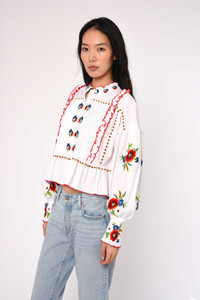 The Florinda Top will be your favorite top this season. This long sleeve blouse in bright white soft cotton features vibrant embroidery contrast. Each ruffle is finished with a red embroidered edge, and the blouse is filled with handcrafted details. The pleated bodice t is paired with a functional center front button down placket