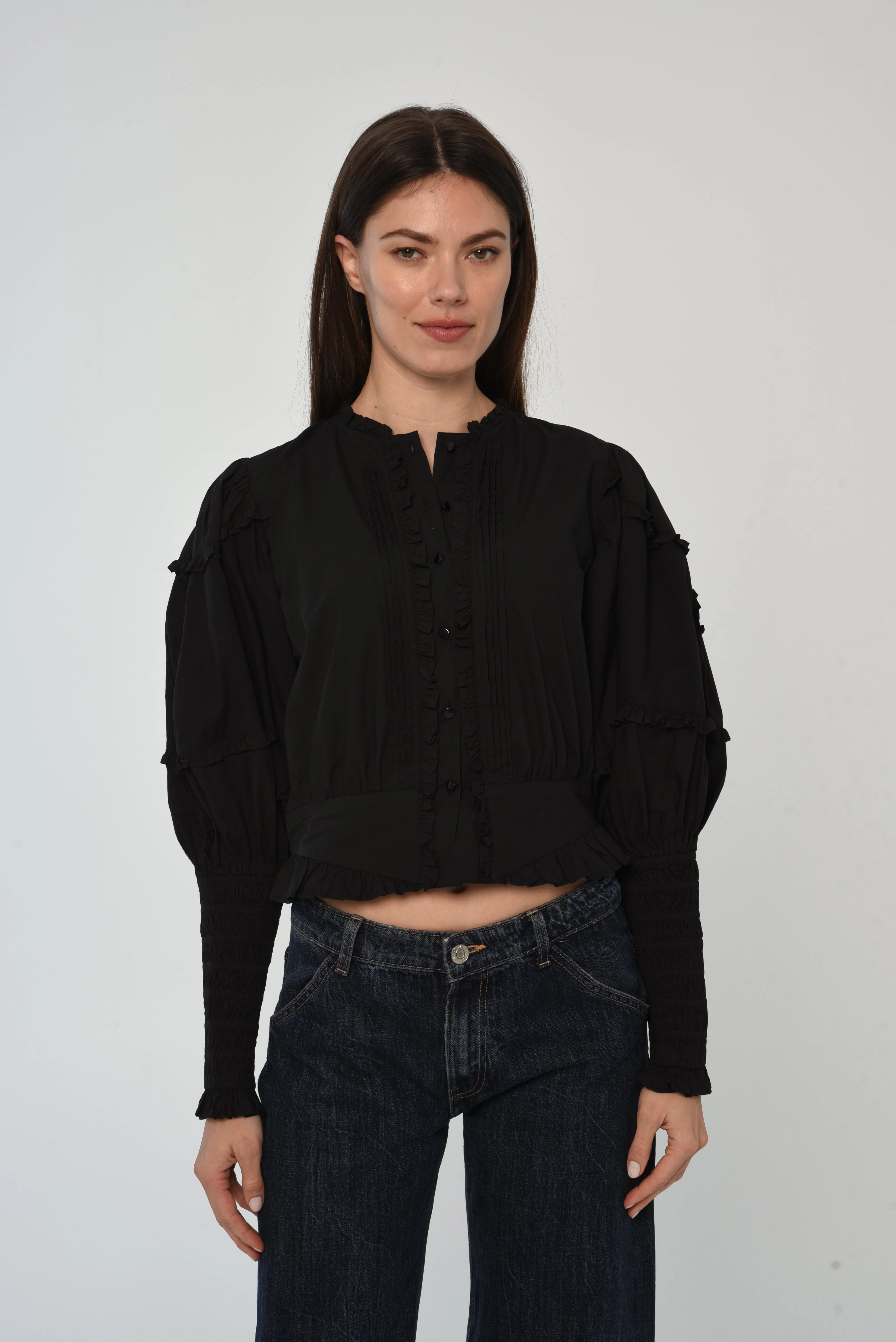 Welcome the vintage-inspired Marius Top in our classic Cotton Poplin. Offered in both white and black, this piece easily becomes a wardrobe staple. It showcases mini ruffled details on the puff sleeves, along the center front, and at the hem, paired with a flattering, exaggerated smocked cuff and a yoke detail finished with a ruffle. Fully button-up, she’s beautiful for any season.