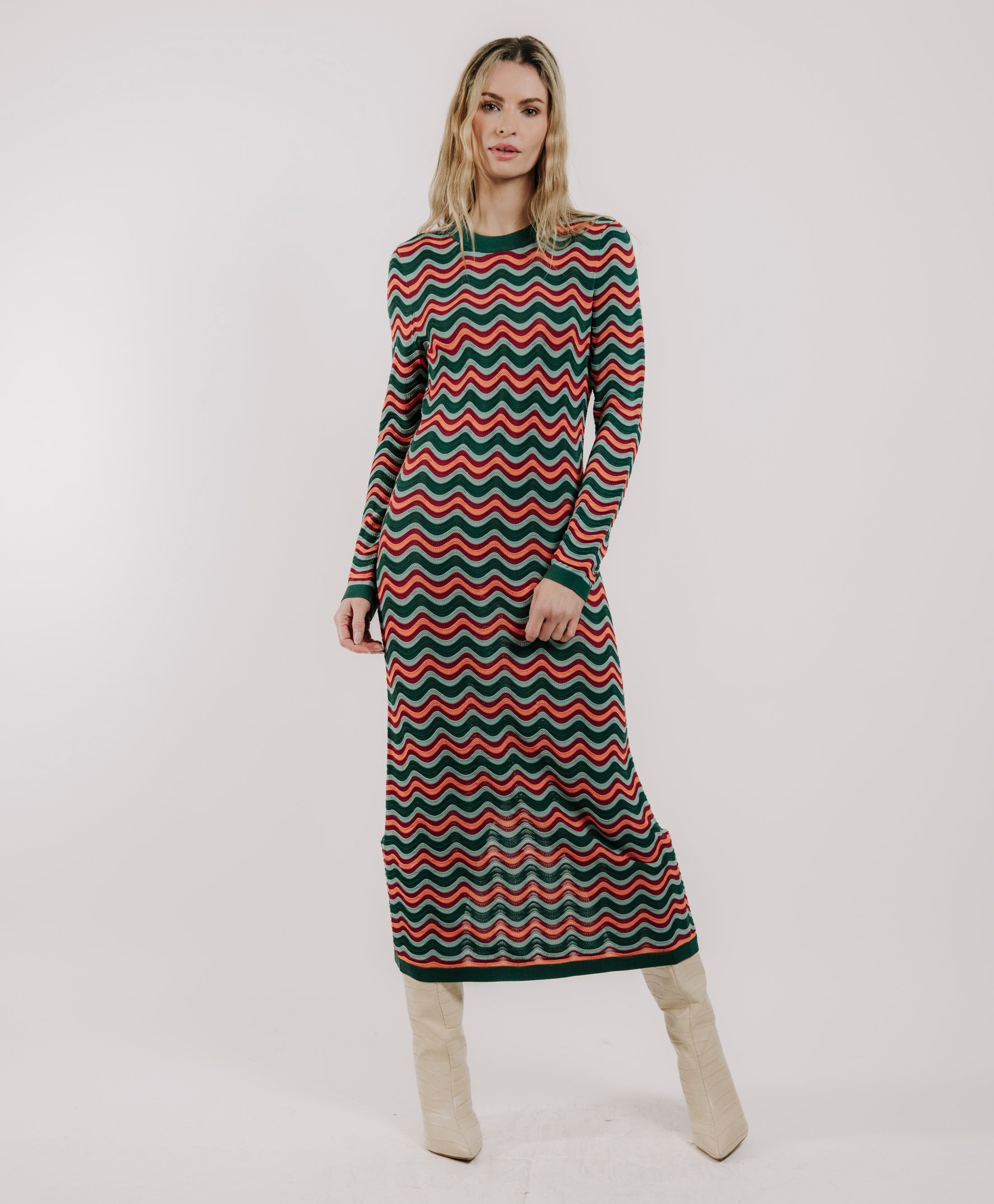 The Sarafina Dress features a bold wave stripe in green multi, designed in a fitted knit silhouette with long sleeves and a floor-grazing hem. Vibrant and playful, it’s a statement-making piece for both day and night.