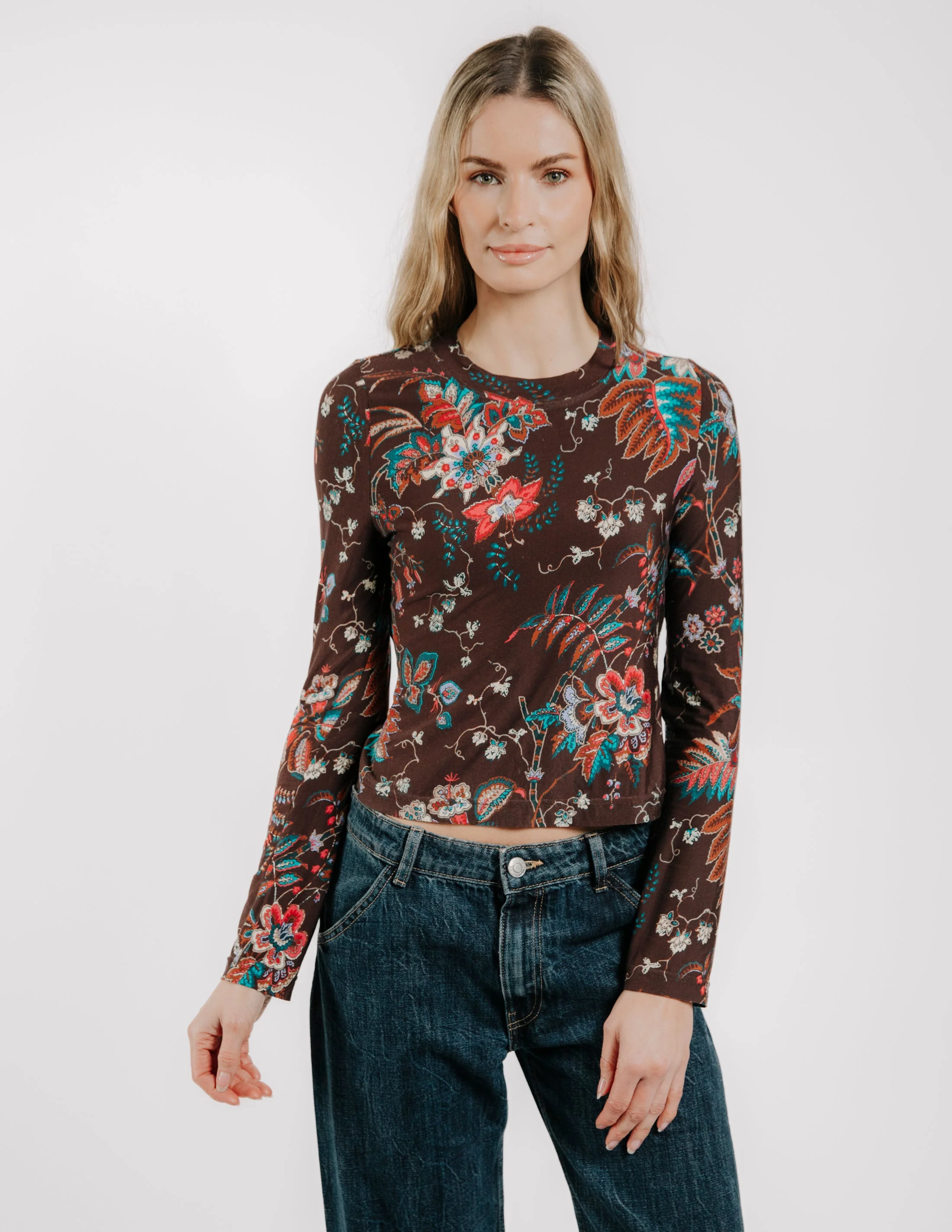 The Sarafina Tee in Charlotte Floral Print in our signature buttery soft knit jersey wears effortlessly for everyday. A versatile layering piece that pairs seamlessly back with denim, chocolate, and cognacs