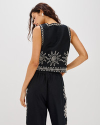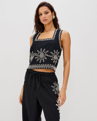 The LSPACE x Rails capsule embodies effortless Southern California style and gorgeous, thought-out details. The Akira Top takes all of that into consideration with its stunning sun embroidery across the chest and trim. Thick tank straps and a cropped silhouette add to the allure. Wear this with the matching Emmie Pants for a look that will have you ready for anything. - Front Body Length: 18 3/4" - Measured from Small - Recommend ordering true to size. - 100% Linen