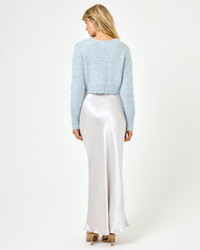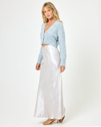 The Crystal Cardigan is a big mood. This cropped sweater is so soft and the button front combined with crystal embellishment lends a festive flair. Outfit idea: pair it with our Sweet as Honey Satin Skirt and a little kitten heel. - Cropped Cardigan - Button Front - Jewel Detailing - Snowflake Sweater Knit - Size XS-XL - 38% Polyester, 34% Nylon, 27% Acrylic, 1%Spandex - Style # CRYSW25 FIT - Model Measurements: Lura, size S - Height 5'9, Bust 32", Waist 24", Hips 34"