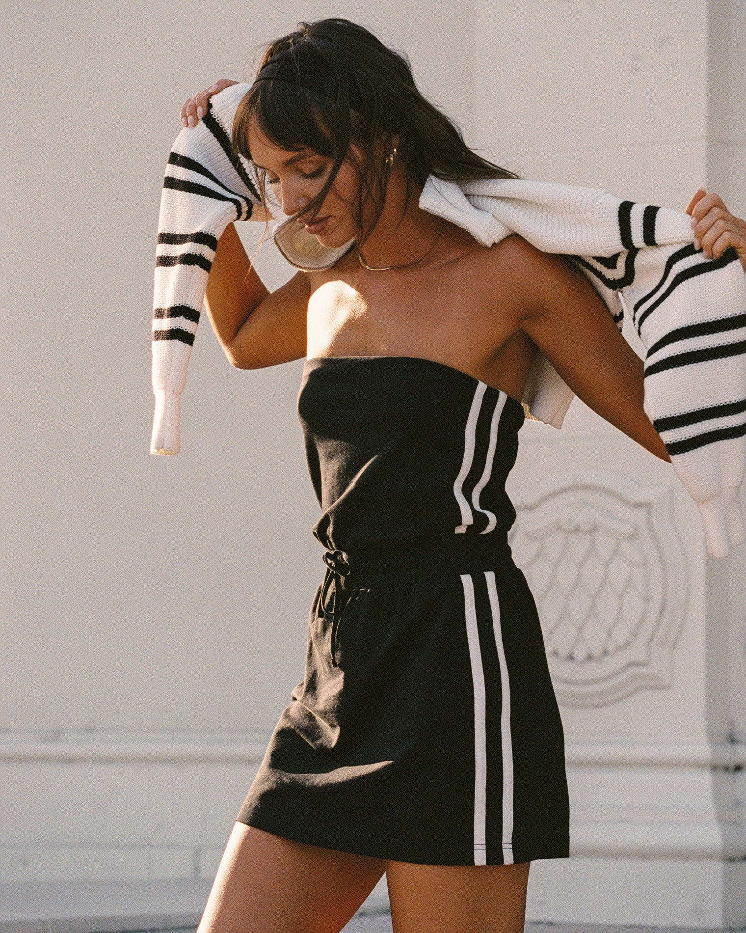 Fashion meets fitness with the Decker Dress! An update on a strapless mini, this comfy cutie has a drawstring waist, pockets at the hip and our signature colorblock detail. - Strapless - Drawstring Waist - Pockets At Hips - Mini Dress FIT - Maitlyn is wearing size S | Height 5'9, Bust 34", Waist 24", Hips 35"