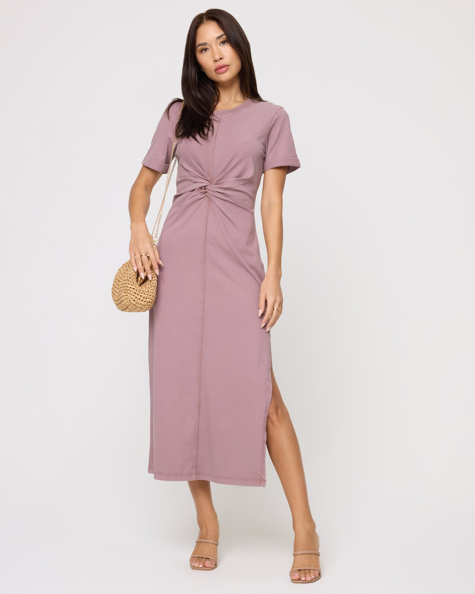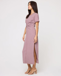 Looking for a dress that you can throw on and go? We found her! The Drew Dress is a midi-length short-sleeve t-shirt style dress with a twist at front to add some spice. A leg slit also ups the appeal. Choose from three neutral colorways. - Ankle Length Dress - Short Sleeve - Cuffed Sleeve - Relaxed Fit - Leg Slit - Twist at Front - Size XS-XL - 100% Cotton - Style # DREDR24 FIT - Model Measurements: Jocelyn, size S - Height 5’9”, Bust 32", Waist 24", Hips 34"