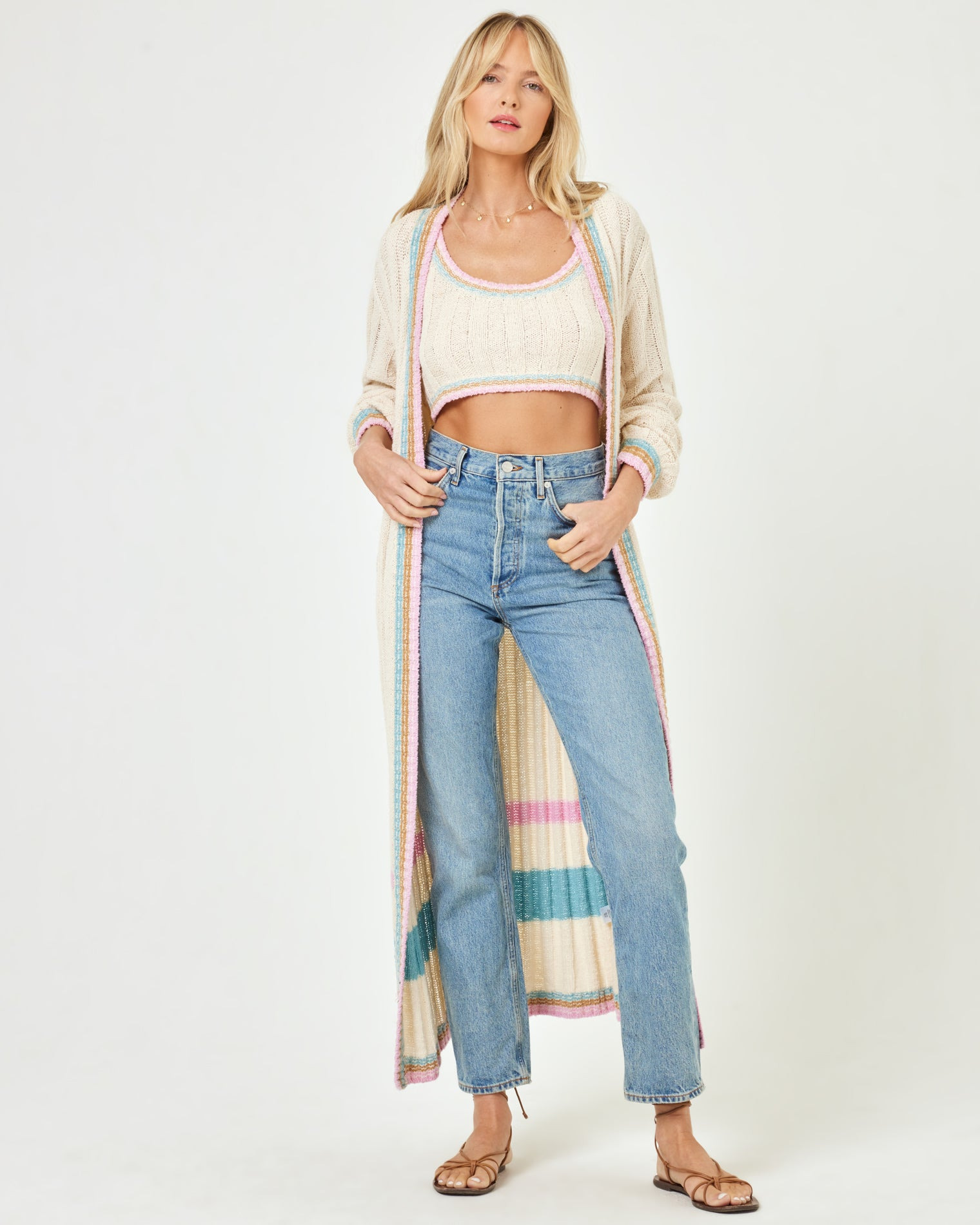 You'll be super cozy in the Ivy Duster. This ankle-length sweater will have you wrapped in warmth thanks to its self tie waist, ribbing at the cuff and neckline and a colorblock hem. Pair it with the matching joggers and tank for a pulled together lounge look. - Ankle L - ength Duster - Self Tie Waist - Rib At Cuff and Neckline - Colorblock Hem - Size XS/S, M/L - 68% Cotton, 32% Nylon - Like all delicates, shape, color and fit are best preserved if hand washed in cold water. Lay flat to dry. - Style # IVYSW24 - Model Measurements: Lura, size S - Height 5'9, Bust 32", Waist 24", Hips 34"
