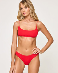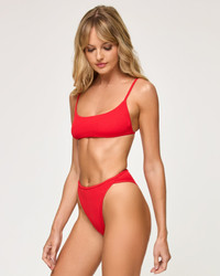 Everybody is built differently and that's why we created the Kourt! This bikini top is tiny but mighty. With minimal coverage and support, this one was made to show off. It features over-the-shoulder adjustable skinny straps, a hook at the back and bralette silhouette. Mix and match it with any of the bottoms from our iconic ribbed collection. - Bralette - Skinny straps - Hook at back, - Adjustable slider straps - Ribbed - Size XS-XL - 92% Nylon, 8% Spandex - Style # RHKOT25 FIT - Coverage: M - inimal - Support: Minimal - Model Measurements: Lura, size S - Height 5'9, Bust 32", Waist 24", Hips 34"