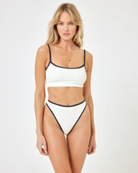 There's something about a longline bralette style that is just. so. flattering! The Adalyn combines soft ribbed fabric with iconic color blocking to create your new favorite bikini top. - Midi Bralette - Ribbed - Colorblocked - Size XS-XL - 97% Nylon, 3% Spandex - Unsure of your size? No worries! We recommend sizing up in our swim to get that perfect, feel-good fit. - Style # RHADT23 FIT - Coverage: Full - Support: Full - Model Measurements: Lura, size S - Height 5'9, Bust 32", Waist 24", Hips 34"