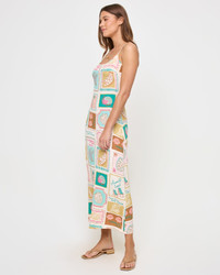 Get ready to fly away on that trip you've been dreaming about in the Summer Somewhere Slip Dress. Our "Postcards" printed fabric features colorful resort-inspired graphics while wearable details including a criss-cross back and adjustable straps ensures this dress can go with you anywhere. - Slip Dress - Criss Cross Back - Adjustable Straps - XS-XL - 100% Viscose