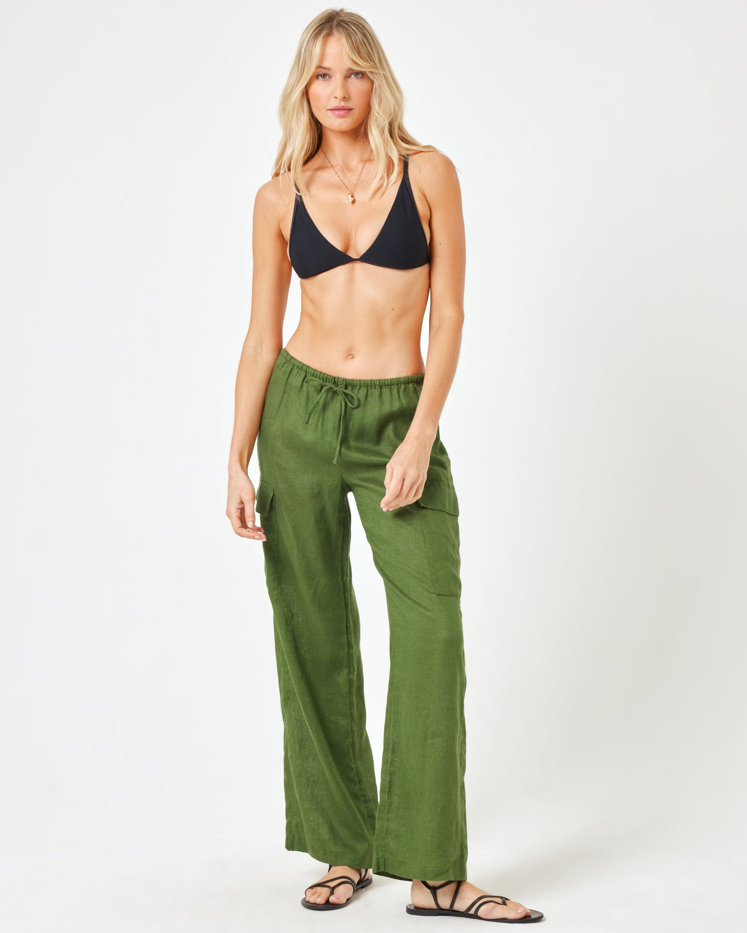 We love the cargo trend so much that we made our own! The Sundown Cargo Pants are showing up with style thanks to their mid rise, tie waist and generous wide leg. We didn't skimp on the pockets either. Wear them with your fave t-shirt or with the matching top for a complete set. - Cargo Pant - Pockets At Thigh - Pocket on Butt - Mid or High Rise - Tie Waist - Relaxed Leg - Size XS-XL - 100% Linen - Style # SUNPA24 FIT - Model Measurements: Lura, size S - Height 5'9, Bust 32", Waist 24", Hips 34"