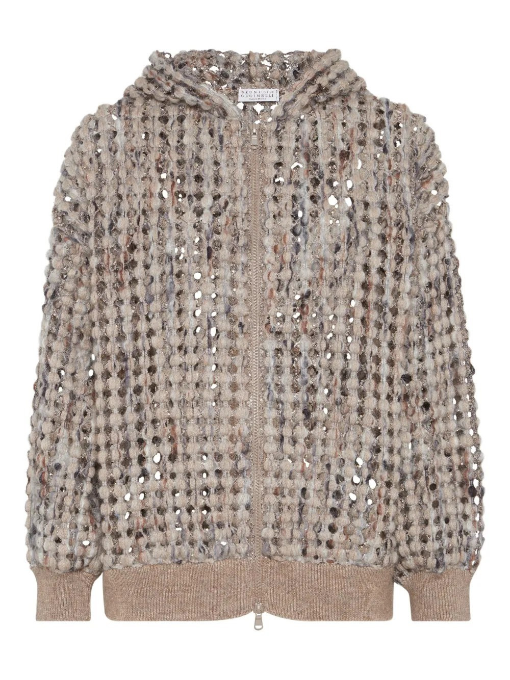 Virgin wool, cashmere and mohair balloon net embroidery cardigan with hood