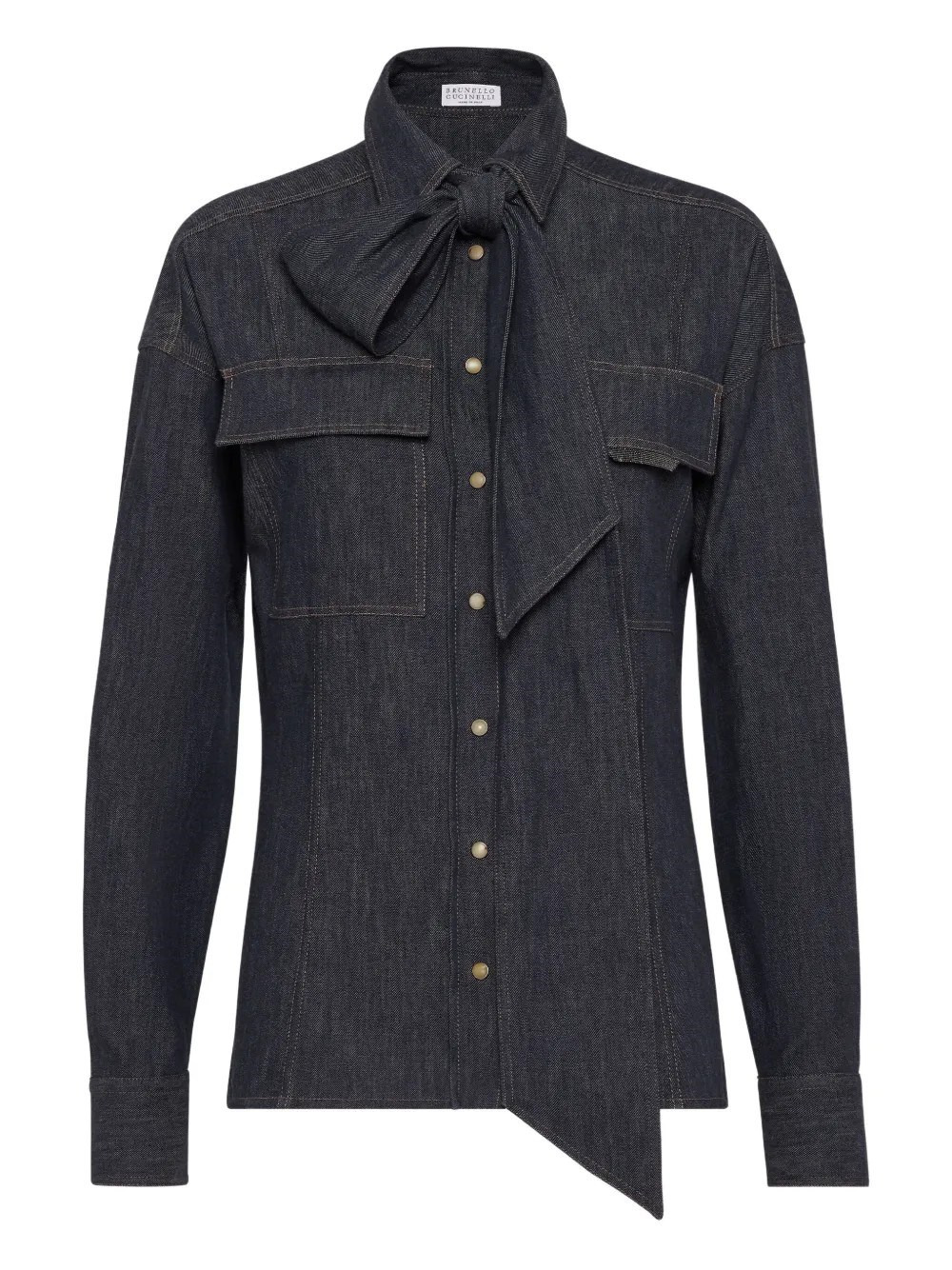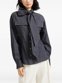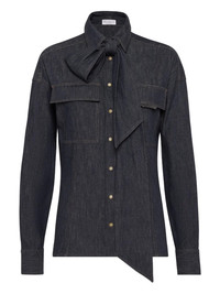 Lightweight no-fade denim pussybow shirt with shiny flap detail