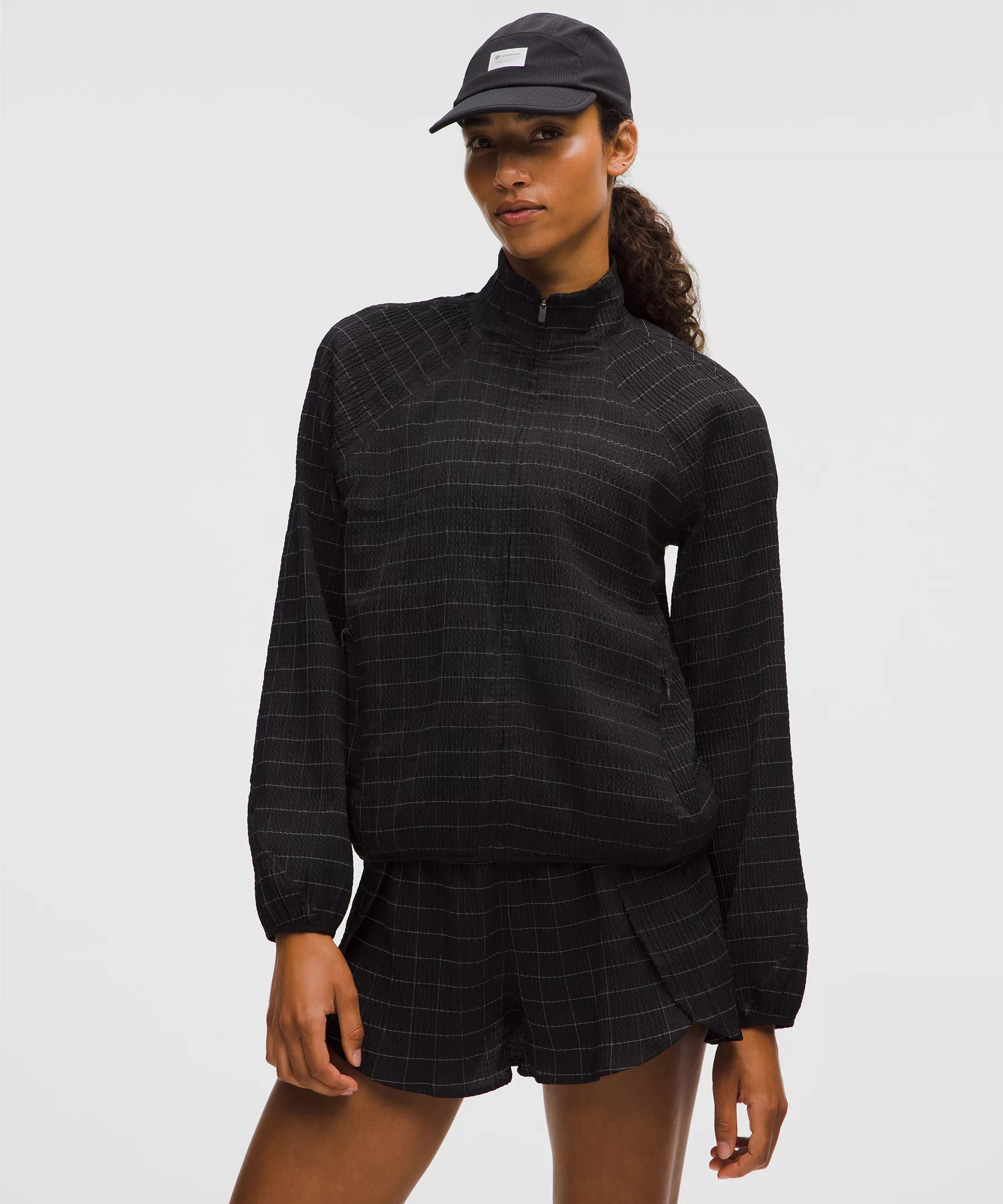 Designed for Running Reflective Seersucker Fabric - Lightweight - Sweat-wicking - Quick-drying - Reflective yarns knit throughout - This product contains recycled polyester made from repurposed plastic waste Relaxed Fit, Hip Length - A loose fit with a little extra room - Sits below the waistband for moderate, everyday coverage Product Features - Zippered hand pockets with hidden phone sleeve - Locker loop for easy hanging Material and care Materials Lining: 86% Recycled Polyester14% Elastane - Body: 84% Recycled Polyester9% Elastane7% Polyester Care Machine Wash Cold - Do Not Bleach - Line Dry - Do Not Iron - Do Not Dry Clean - Wash With Like Colors