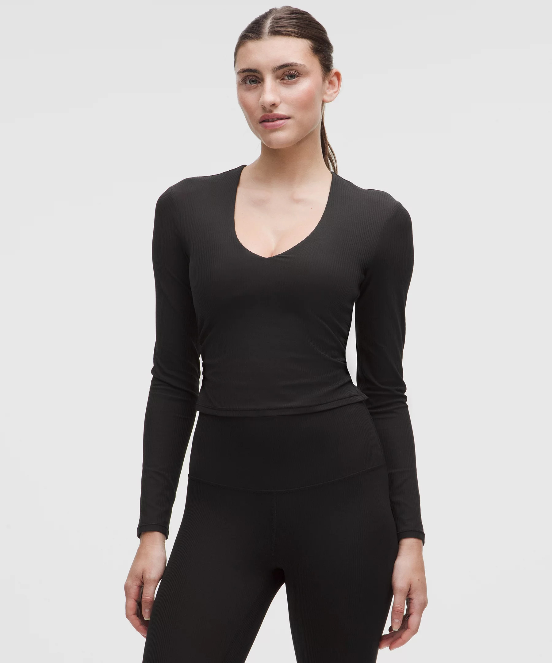 Designed for Yoga Buttery-Soft, Ribbed Nulu™ Fabric - Buttery-soft, ribbed texture - Sweat-wicking - Quick-drying - Four-way stretch - Added Lycra® fibre for stretch and shape retention - Shelf bralette is made from a lightweight version of our luxuriously soft SmoothCover™ fabric Light Support, B–D Cups - Intended to provide light support for B–D cups - Slim fit skims your body - Waist length is not too short, not too long, just right around the waistband - Intended for low-impact activities Product Features - Built-in shelf bralette for added support and coverage - Pockets for optional, removable cups - Side slits at the hems Material and care Materials Mesh: 89% Recycled Nylon11% Elastane - Body: 78% Nylon22% Lycra Elastane - Bra Lining: 83% Recycled Polyester17% Elastane Care Machine Wash Cold - Do Not Bleach - Tumble Dry Low - Do Not Iron - Do Not Dry Clean - Wash With Like Colors
