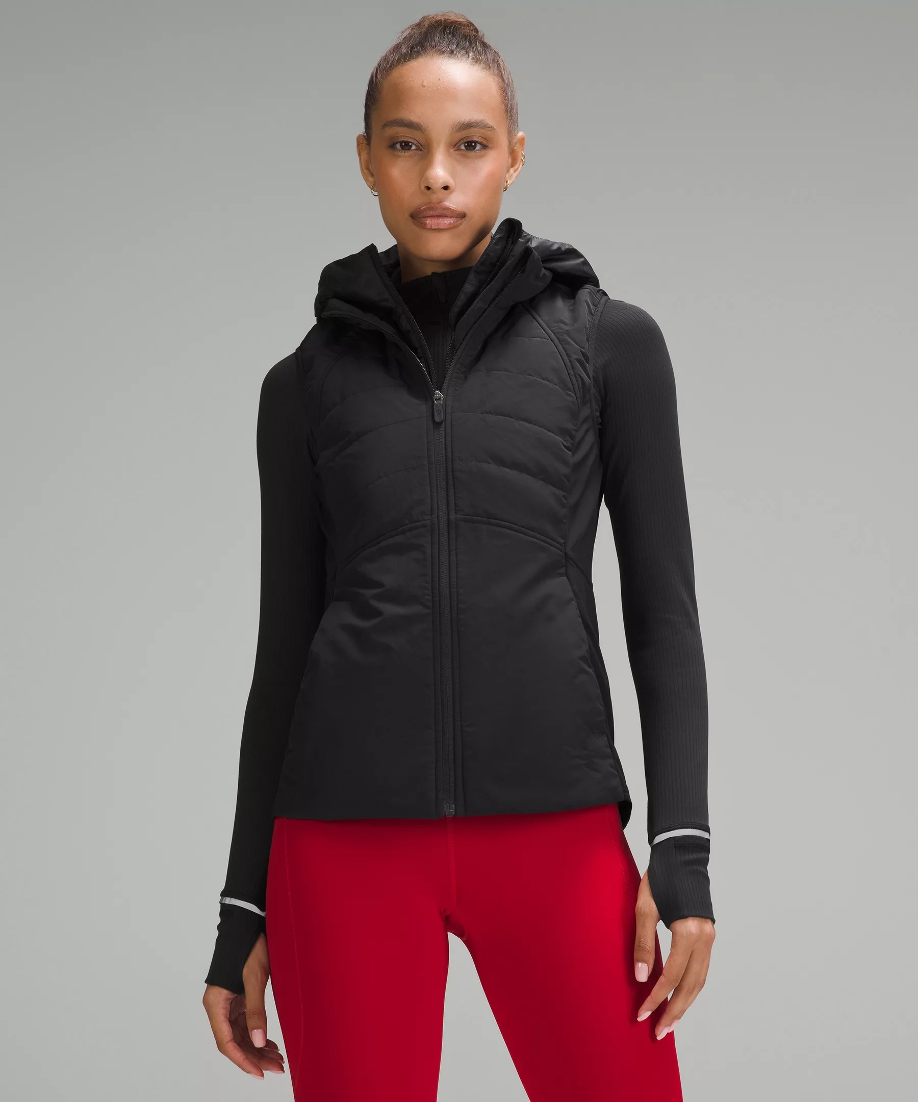 Water-Repellent, Glyde™ Fabric Water-repellent Windproof PrimaLoft® insulation is warm, even when wet Four-way stretch, breathable tech fleece fabric is DWR-treated to protect you from the elements Slim Fit, Hip Length Slim fit skims your body Product Features Removable dickie zips into inside of vest Zippered exterior pockets with a hidden phone sleeve Reflective details Material and care Materials Side panels: 82% Nylon18% Lycra® elastane Hood facing: 100% Polyester Filling: 75% Recycled polyester25% Polyester Lining: 100% Nylon Body: 100% Nylon Hood: 100% Nylon Care Wash with like colours Machine wash cold Do not bleach Tumble dry low Do not iron Do not dry clean Imported