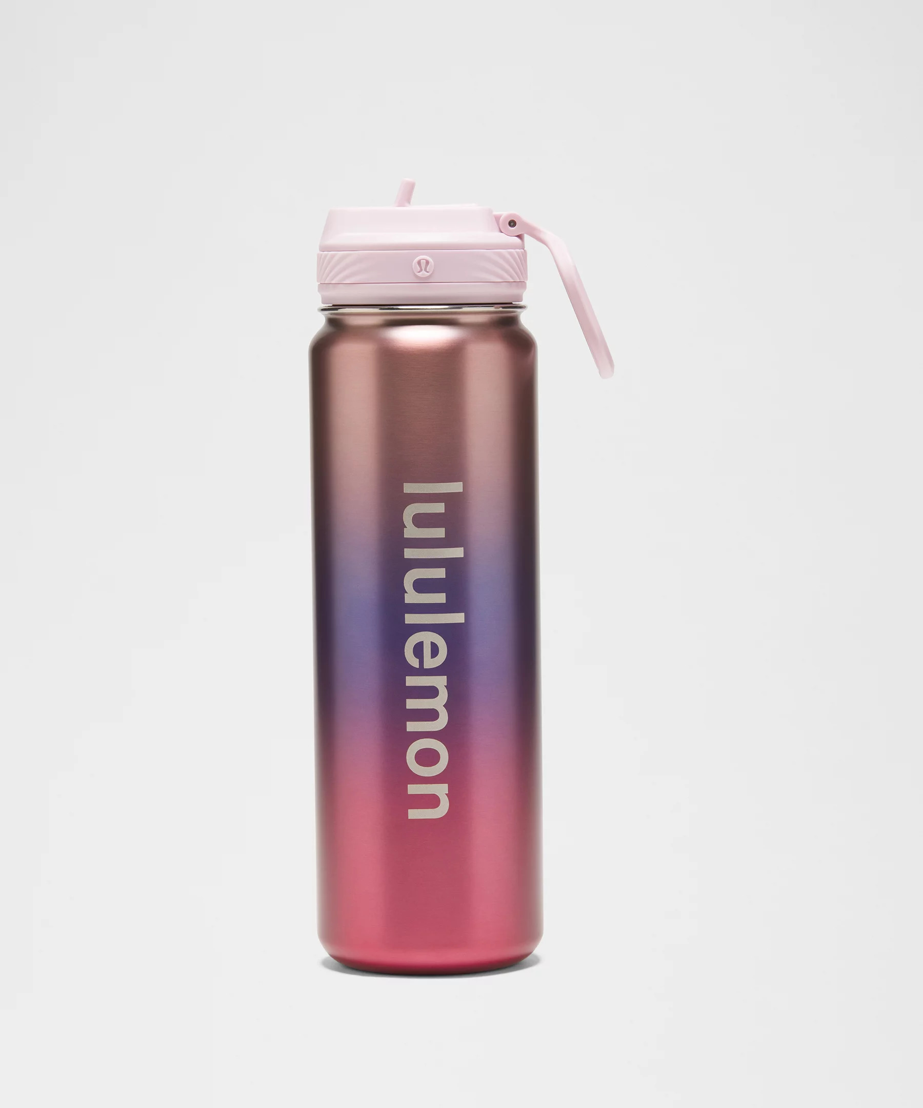 Designed for Casual Dimensions and Volume - Dimensions: 26.4cm x 7.7cm (10.4" x 3") - Volume: 24oz (710ml) Product Features - Folding straw lid for easy sipping - Double-wall design keeps bottle sweat-free - Vacuum insulation keeps drink ice cold - No-flavour transfer keeps contents tasting fresh - Care Instructions: Wash before use. Lid is dishwasher-safe on top rack only. Please hand wash the body of the bottle to preserve the finish. Do not fill with hot water - To deep clean the lid, remove the interior silicone ring and soak in a 2:1 solution of water and vinegar, or cleanse using dish soap. Do not use harsh chemicals like bleach or chlorine - To reassemble, press the ring back into the lid’s open cavity with the tab exposed. Ensure the ring is evenly pressed into the cavity before screwing the lid back on for a secure, leak-proof fit - Due to the nature of the finish, please use care when storing your bottle in bags or backpacks, and around sharp objects such as keys. Hand-wash only as finish may chip or peel in the dishwasher. Natural wear may occur over time Material and care Materials Top: 100% Polypropylene - Body: 100% Steel - Band: 100% Silicone Care Body - Hand Wash Only - Do Not Use with Hot Water - Lid - Dishwasher Top Rack - Wash Before Use