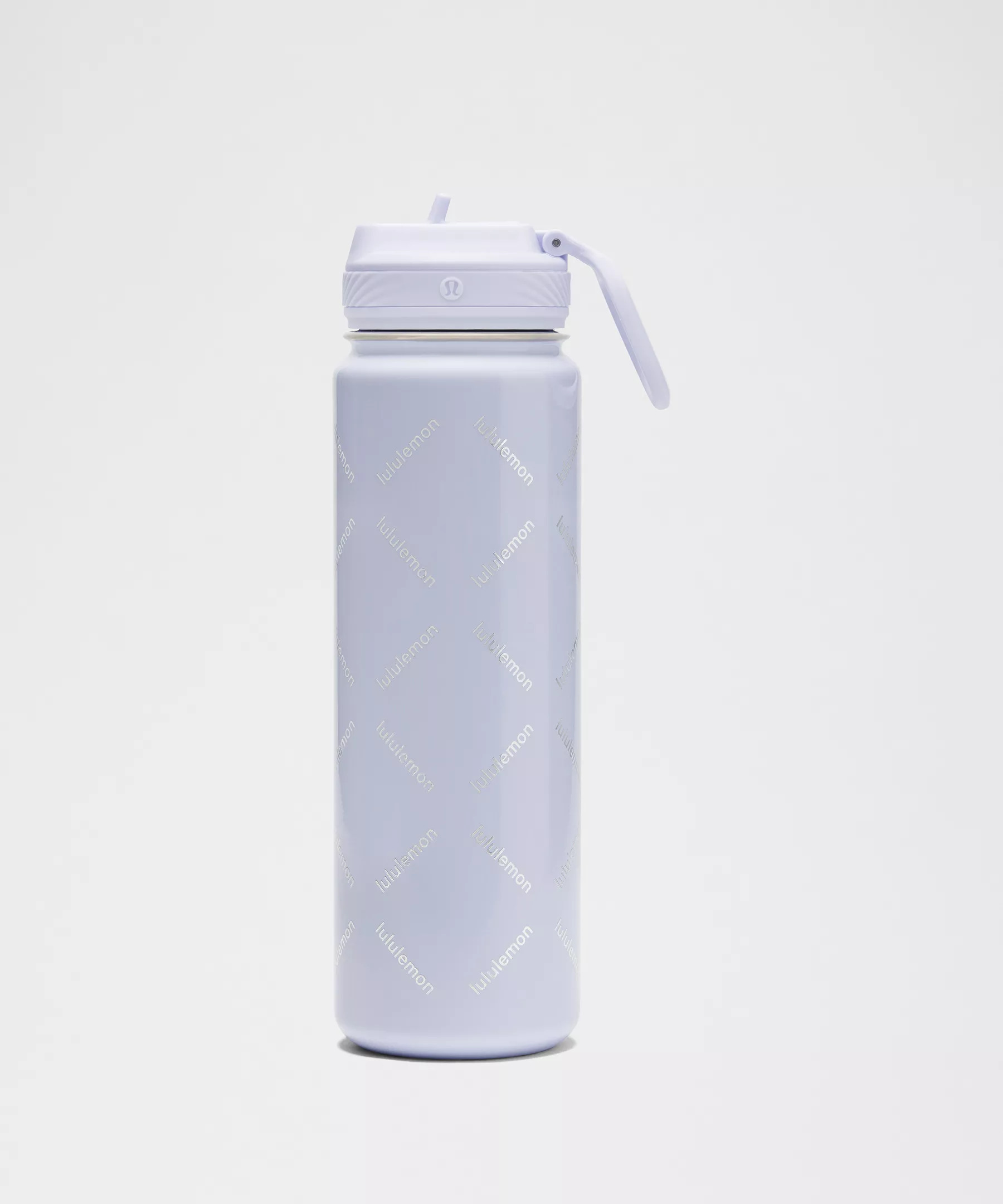 Designed for Casual Dimensions and Volume - Dimensions: 26.4cm x 7.7cm (10.4" x 3") - Volume: 24oz (710ml) Product Features - Folding straw lid for easy sipping - Double-wall design keeps bottle sweat-free - Vacuum insulation keeps drink ice cold - No-flavour transfer keeps contents tasting fresh - Care Instructions: Wash before use. Lid is dishwasher-safe on top rack only. Please hand wash the body of the bottle to preserve the finish. Do not fill with hot water - To deep clean the lid, remove the interior silicone ring and soak in a 2:1 solution of water and vinegar, or cleanse using dish soap. Do not use harsh chemicals like bleach or chlorine - To reassemble, press the ring back into the lid’s open cavity with the tab exposed. Ensure the ring is evenly pressed into the cavity before screwing the lid back on for a secure, leak-proof fit - Due to the nature of the finish, please use care when storing your bottle in bags or backpacks, and around sharp objects such as keys. Hand-wash only as finish may chip or peel in the dishwasher. Natural wear may occur over time Material and care Materials Top: 100% Polypropylene - Band: 100% Silicone - Body: 100% Steel Care Body - Hand Wash Only - Do Not Use with Hot Water - Lid - Dishwasher Top Rack - Wash Before Use