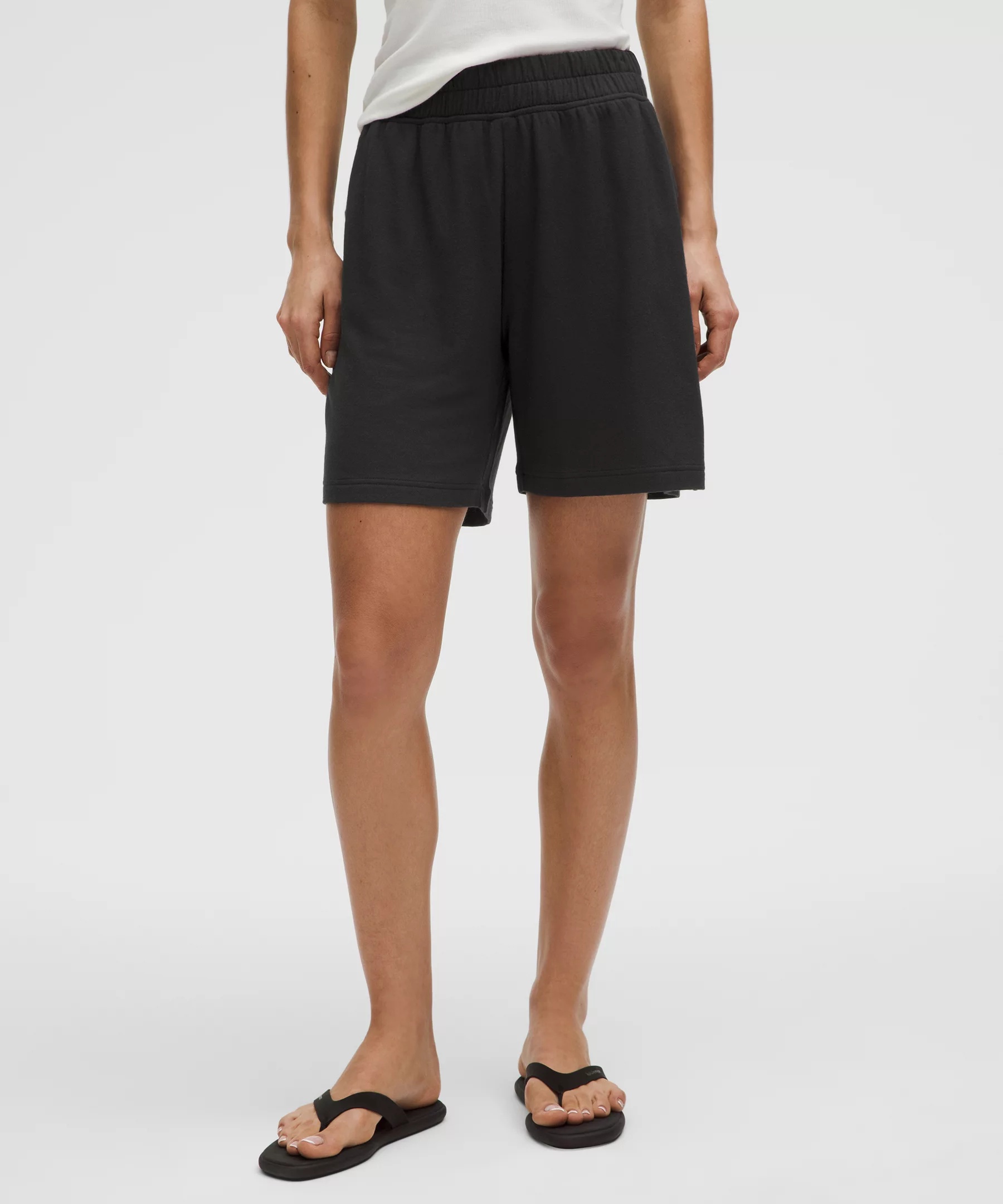 Designed for Yoga Ultra-Soft, BeCalm Fabric - Ultra soft - Modal French terry with an ultra-soft, fuzzy interior - Supple exterior - Four-way stretch - Has a luxurious drape Mid Rise, Above the Knee Length - Relaxed fit is roomy through glutes and thighs - Falls to just above the centre of the kneecap Product Features - Hand pockets with hidden card sleeve Material and care Materials Pocket Lining: 90% Recycled Polyester10% Lycra Elastane - Body: 95% Modal5% Elastane Care