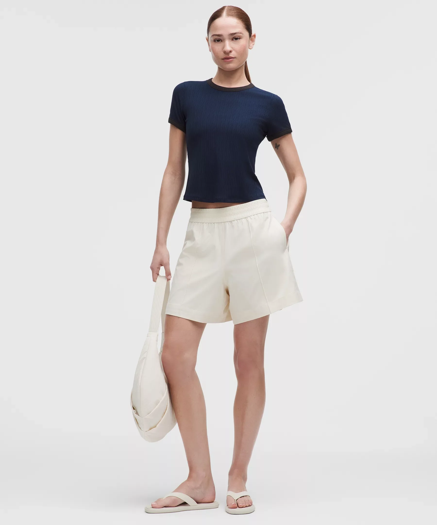 Designed for Casual Lightweight, Swift Fabric - Lightweight - Four-way stretch - Sweat-wicking - Quick-drying - 100% of the polyester in this product is recycled (excluding trims) Lined for Coverage, Mid Rise, 6" Length - Relaxed fit is roomy through glutes and thighs - Lined for extra coverage Product Features - Hand pockets, one with a hidden card sleeve - Elastic waistband Material and care Materials Pockets: 86% Polyester (recycled)14% Elastane - Lining: 86% Polyester (recycled)14% Elastane - Body: 86% Polyester (recycled)14% Elastane Care Machine Wash Cold - Do Not Bleach - Tumble Dry Low - Do Not Iron - Do Not Dry Clean - Wash With Like Colors