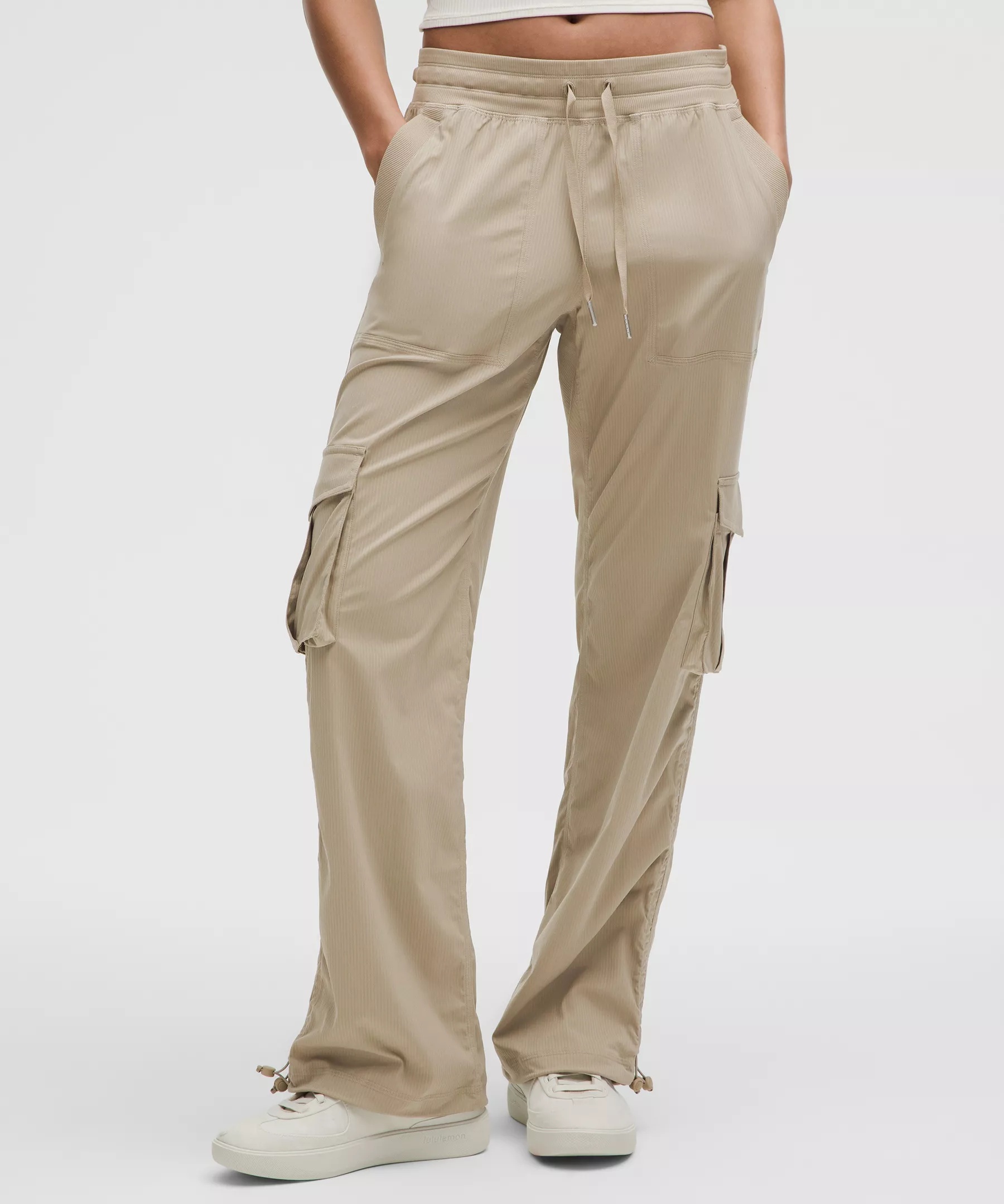 Designed for Casual Lightweight, Swift Fabric - Lightweight - Water-repellent - Two-way stretch Mid Rise, Full Length - This relaxed-fit version of our Dance Studio Pant feels roomier throughout the hips and thighs. Consider sizing down for a less relaxed fit - Full length intended to sit at ankle Product Features - Hand pockets with hidden card sleeve - Back pockets - Cargo pockets - Drawcord to customize fit - Cinchable hems let you adjust the look Material and care Materials Waistband: 88% Nylon12% Lycra Elastane - Body: 94% Nylon6% Elastane - Pocket: 86% Recycled Polyester14% Elastane Care Machine Wash Cold - Do Not Bleach - Tumble Dry Low - Do Not Iron - Do Not Dry Clean - Wash With Like Colors