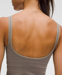 Designed for Yoga Skip-the-Chafe, Seamless Construction - Minimal seams to reduce chafe - Sweat-wicking - Four-way stretch - Added elastane improves stretch and shape retention Light Support, B/C Cups - Intended to provide light support for B/C cups - Tight fit contours your body - Waist length is not too short, not too long, just right around the waistband - Intended for low-impact activities Product Features - Built-in shelf bra for added support and coverage - Pockets for optional, removable cups Material and care Materials Bra: 86% Nylon14% Elastane - Body: 61% Nylon29% Recycled Polyester10% Elastane Care Wash With Like Colors - Do Not Bleach - Tumble Dry Low - Do Not Iron - Do Not Dry Clean - Wash With Like Colors