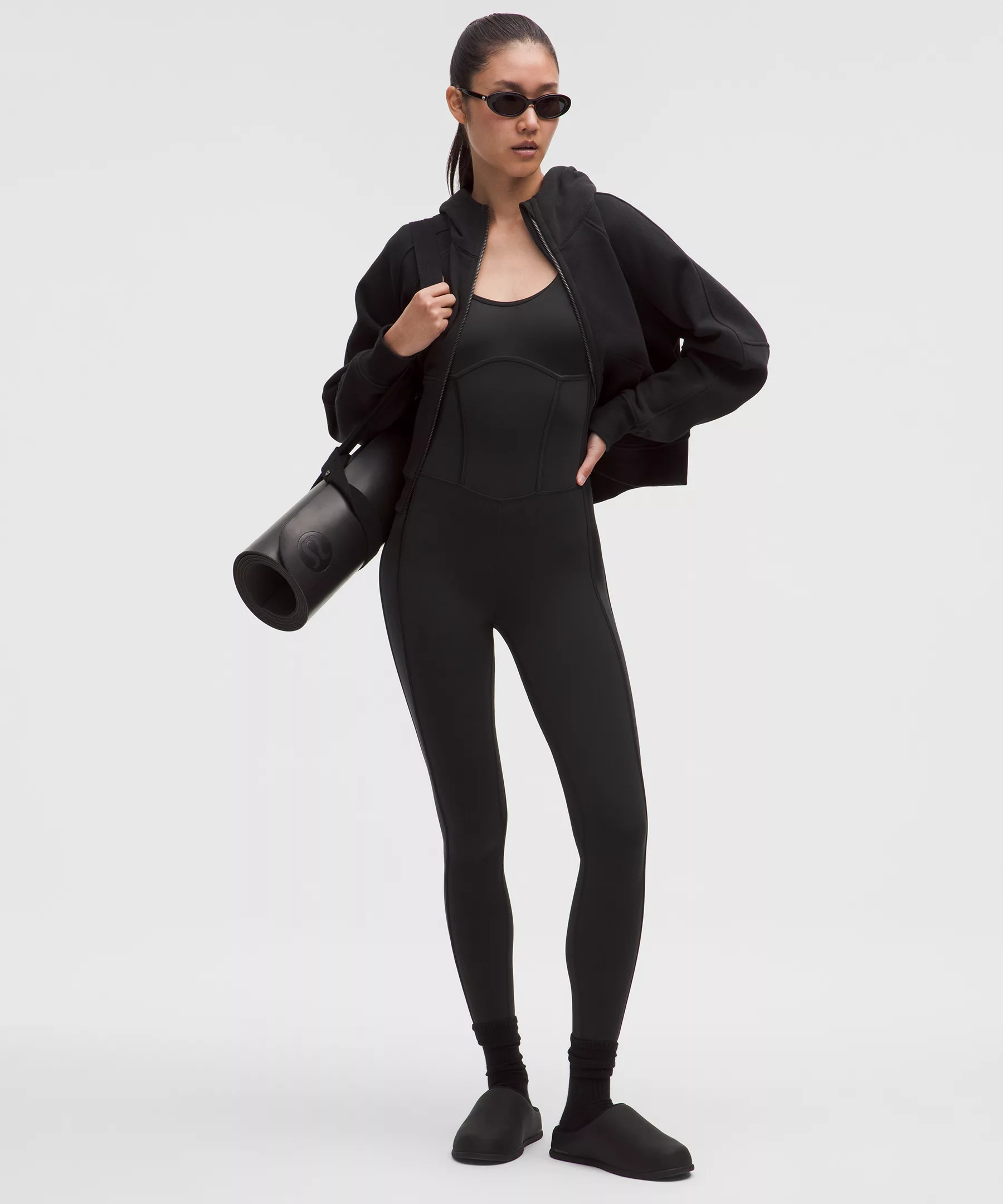 Designed for Yoga Feels Buttery-Soft and Weightless, Nulu™ Fabric - So buttery soft, it feels weightless - Four-way stretch - Sweat-wicking - Breathable - Added Lycra® fibre for stretch and shape retention - Smooth, satiny fabric is four-way stretch and quick-drying with a luxe shine Light Support, A/B Cups - Intended for low-impact activities - 25" length Product Features - Built-in shelf bra for added support and coverage - Pockets for optional, removable cups - Keyhole in the back for airflow Material and care Materials Body: 81% Nylon19% Lycra Elastane - Bra Lining: 81% Nylon19% Lycra Elastane - Contrast: Face: 77% Nylon, 23% Lycra Elastane - Gusset: 81% Nylon19% Lycra Elastane - Middle Layer: 89% Recycled Nylon11% Elastane - Under Band Lining: 100% Recycled Polyester Care Machine Wash Cold - Do Not Bleach - Tumble Dry Low - Do Not Iron - Do Not Dry Clean - Wash With Like Colors