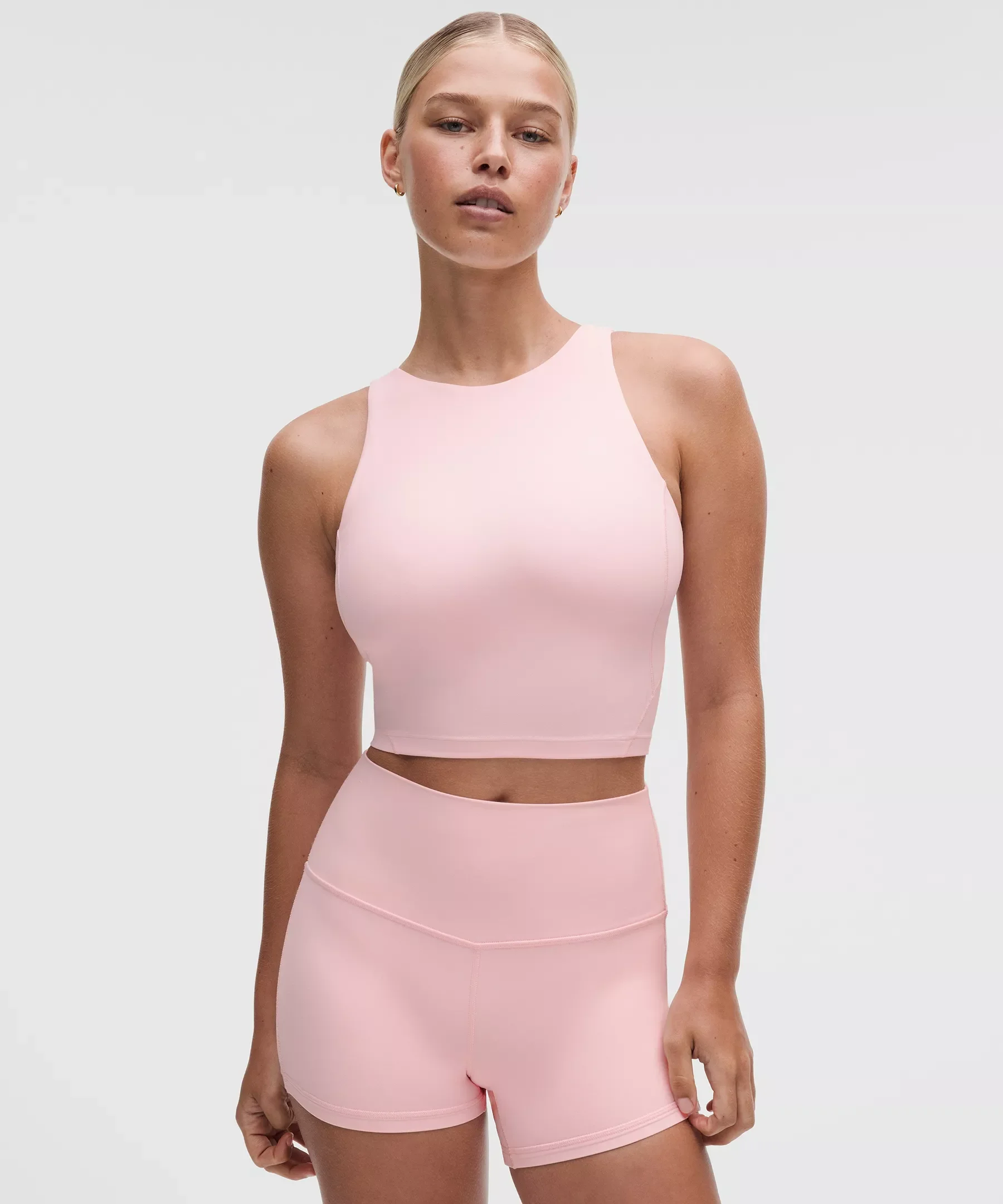 Designed for Yoga Feels Buttery-Soft and Weightless, Nulu™ Fabric - So buttery soft, it feels weightless - Four-way stretch - Sweat-wicking - Breathable - Added Lycra® fibre for stretch and shape retention Light Support - Sizes 0-14 fit C/D cups - Sizes 16-20 fit DD/DDD cups - Tight fit contours your body - Cropped length is cut above the waist—perfect with high-rise pants - Intended for low-impact activities Product Features - Built-in shelf bra for added support and coverage - Pockets for optional, removable cups - High neck for added coverage Material and care Materials Bra Lining: 81% Nylon19% Lycra Elastane - Middle Layer: 89% Nylon11% Elastane - Body: 81% Nylon19% Lycra Elastane Care Machine Wash Cold - Do Not Bleach - Tumble Dry Low - Do Not Iron - Do Not Dry Clean - Wash With Like Colors