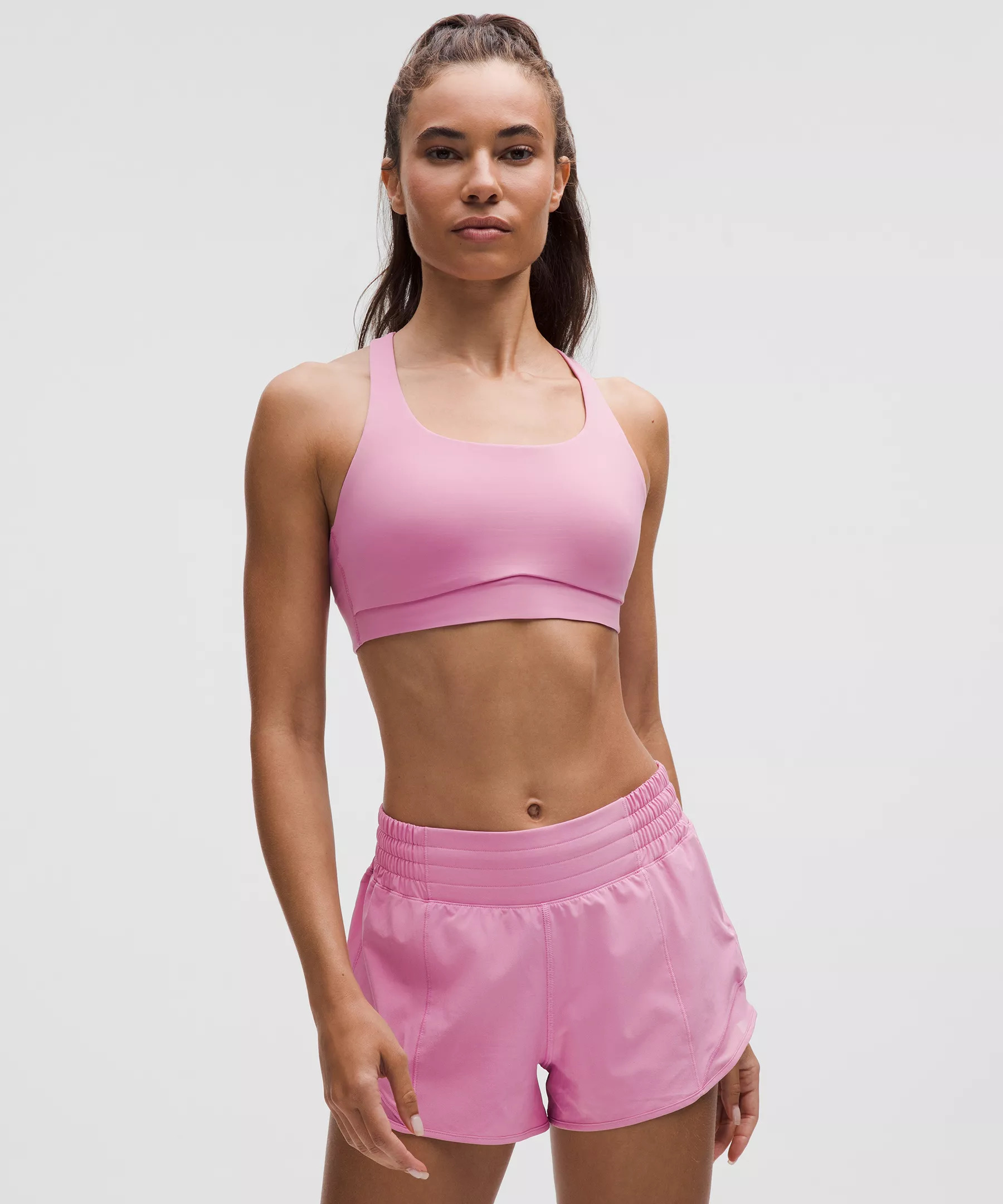 Designed for Yoga and Training Smooth, Sweat-Wicking Fabric - Sweat-wicking - Smooth - Four-way stretch - Quick-drying - Added elastane improves stretch and shape retention Medium Support, B–D Cups - Intended for medium-impact activities Product Features - Back crossover straps are placed to clear shoulder blades for minimal distractions and have varied widths for dimension - Lightweight elastic underband is thoughtfully constructed with low-profile seams for optimal comfort - Pockets for optional, removable cups Material and care Materials Bra Lining: Face: 89% Recycled Polyester, 11% Elastane - Bra: Face: 77% Recycled Nylon, 23% Elastane - Middle Layer: 89% Nylon11% Elastane Care Machine Wash Cold - Do Not Bleach - Tumble Dry Low - Do Not Iron - Do Not Dry Clean - Wash With Like Colors