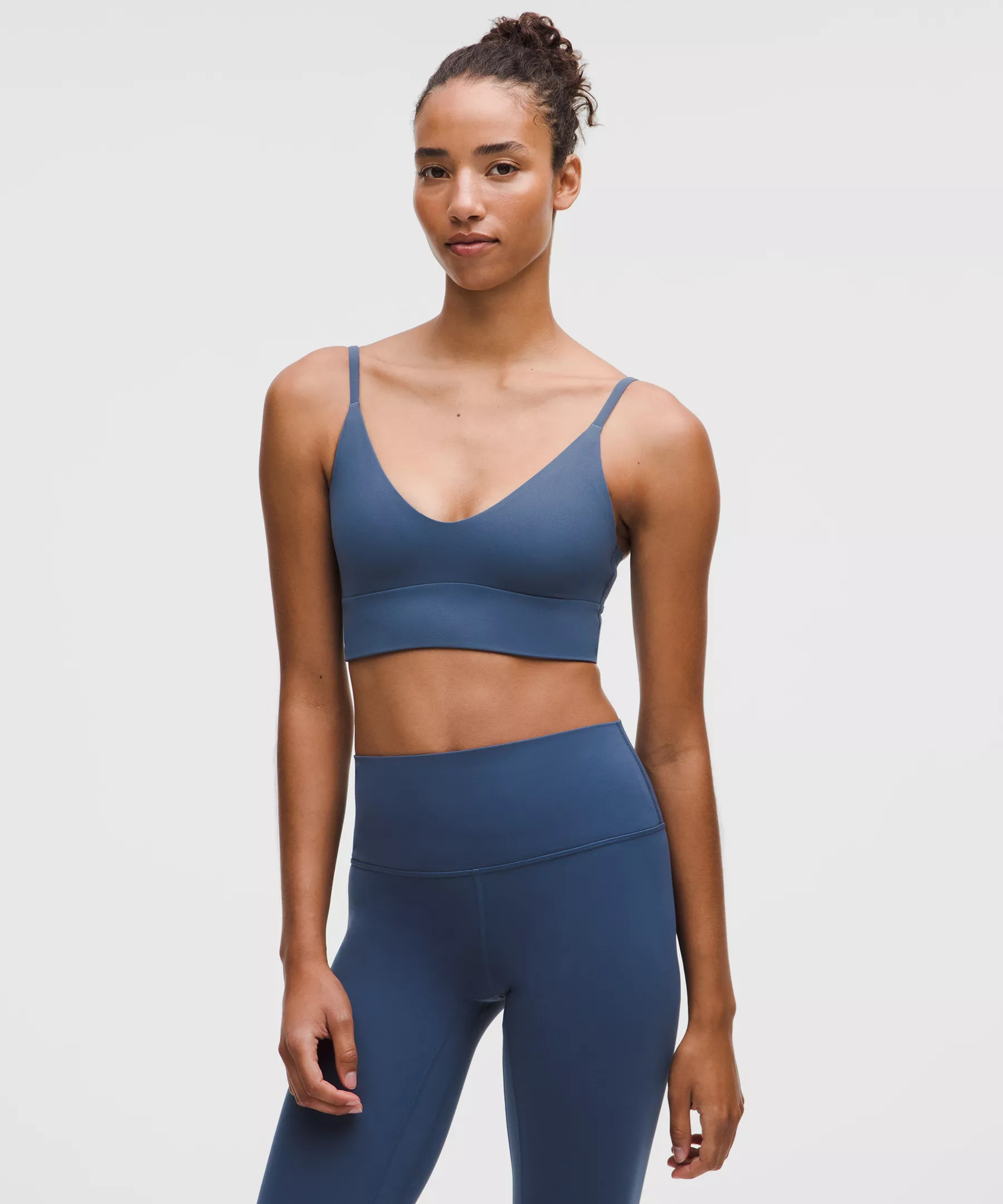 Designed for Yoga Feels Buttery-Soft and Weightless, Nulu™ Fabric - So buttery soft, it feels weightless - Four-way stretch - Sweat-wicking - Breathable - Added Lycra® fibre for stretch and shape retention Light Support, A/B Cups - Intended for low-impact activities Product Features - Minimal construction and moulded cups give shaping and a lightweight, comfortable sensation - Removable cup inserts provide extra coverage - High-stretch underband sits comfortably on body and is easy to put on and take off Material and care Materials Bra Lining: 81% Nylon19% Lycra Elastane - Middle Layer: 73% Nylon27% Lycra Elastane - Bra: 81% Nylon19% Lycra Elastane Care Machine Wash Cold - Do Not Bleach - Line Dry - Do Not Iron - Do Not Dry Clean - Wash With Like Colors