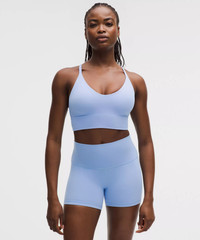 Designed for Yoga and Pilates Feels Buttery-Soft and Weightless, Nulu™ Fabric - So buttery soft, it feels weightless - Four-way stretch - Sweat-wicking - Breathable - Added Lycra® fibre for stretch and shape retention Light Support, C/D Cups - Intended for low-impact activities Product Features - Minimal construction and moulded cups give shaping and a lightweight, comfortable sensation - Removable cup inserts provide extra coverage - High-stretch underband sits comfortably on body and is easy to put on and take off Material and care Materials Bra Lining: 81% Nylon19% Lycra Elastane - Middle Layer: 73% Nylon27% Lycra Elastane - Bra: 81% Nylon19% Lycra Elastane Care Machine Wash Cold - Do Not Bleach - Line Dry - Do Not Iron - Do Not Dry Clean - Wash With Like Colors