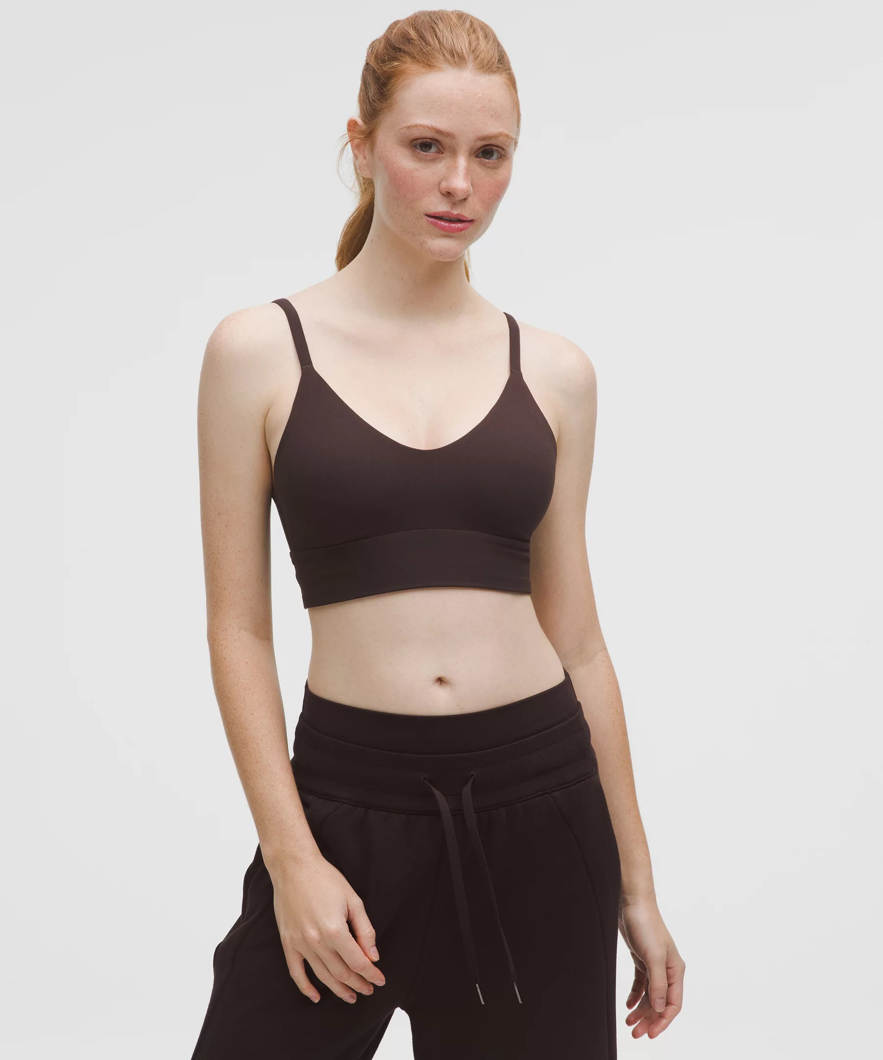 Designed for Yoga Feels Buttery-Soft and Weightless, Nulu™ Fabric - So buttery soft, it feels weightless - Four-way stretch - Sweat-wicking - Breathable - Added Lycra® fibre for stretch and shape retention Light Support, C/D Cups - Intended for low-impact activities Product Features - Minimal construction and moulded cups give shaping and a lightweight, comfortable sensation - Removable cup inserts provide extra coverage - High-stretch underband sits comfortably on body and is easy to put on and take off Material and care Materials Bra: 81% Nylon19% Lycra Elastane - Bra Lining: 81% Nylon19% Lycra Elastane - Middle Layer: 73% Nylon27% Lycra Elastane Care Machine Wash Cold - Do Not Bleach - Line Dry - Do Not Iron - Do Not Dry Clean - Wash With Like Colors