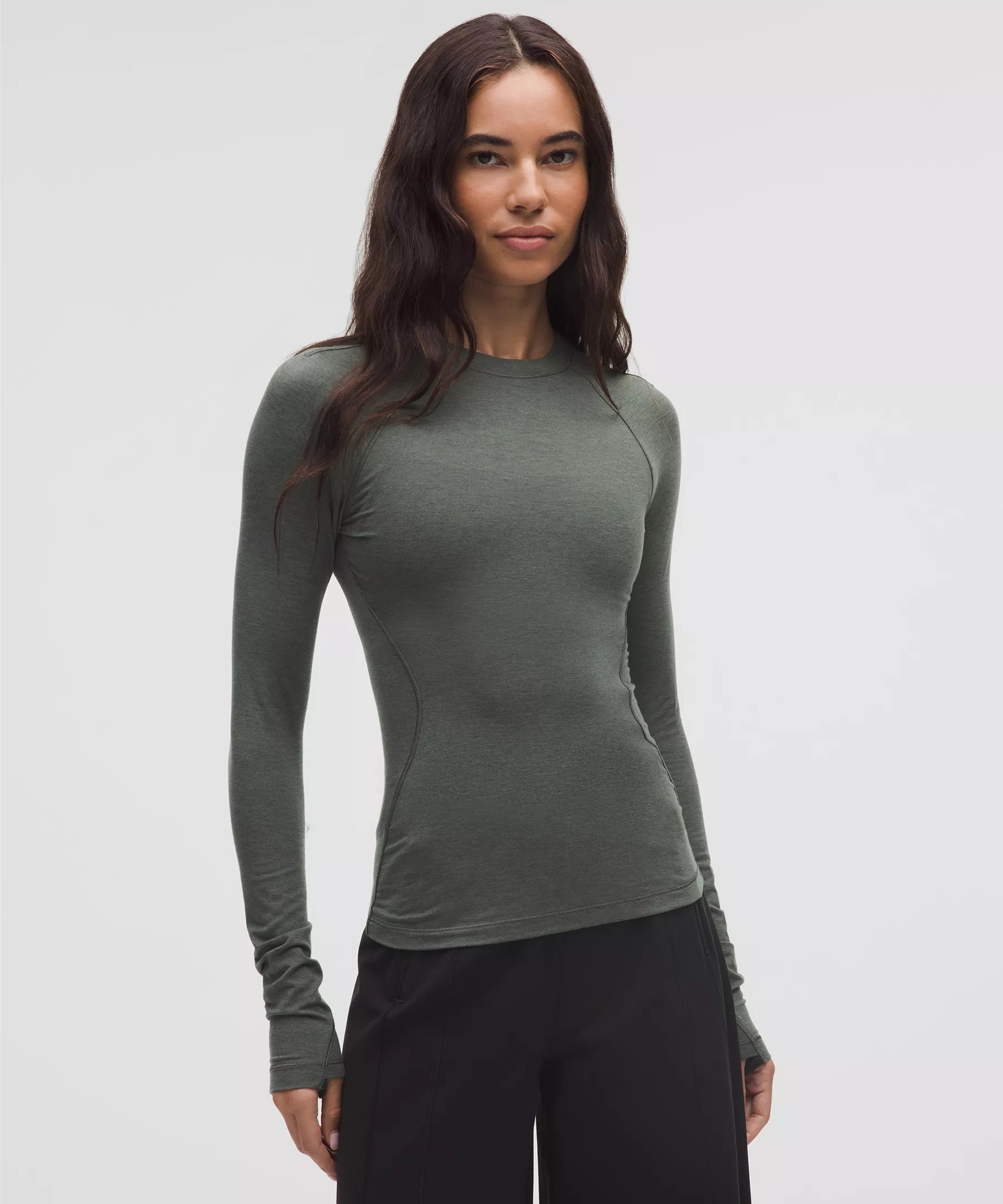Designed for Hiking Naturally Thermoregulating, Merino Wool-Blend Fabric - Naturally thermoregulating - Soft against skin - Provides mid-warmth - Be gentle and treat with care. Please refer to the material and care section below for full fibre content information and wash instructions - Fabric is derived from wood-based materials from well-managed forests Tight Fit, Hip Length - Contours your body - Sits below the waistband for moderate, everyday coverage Product Features - Thumbholes help keep sleeves down and hands warm Material and care Materials Body: 59% Tencel Lyocell31% Merino Wool10% Elastane Care Machine Wash Cold Gentle - Do Not Bleach - Tumble Dry Low - Do Not Iron - Do Not Dry Clean - Wash Separately