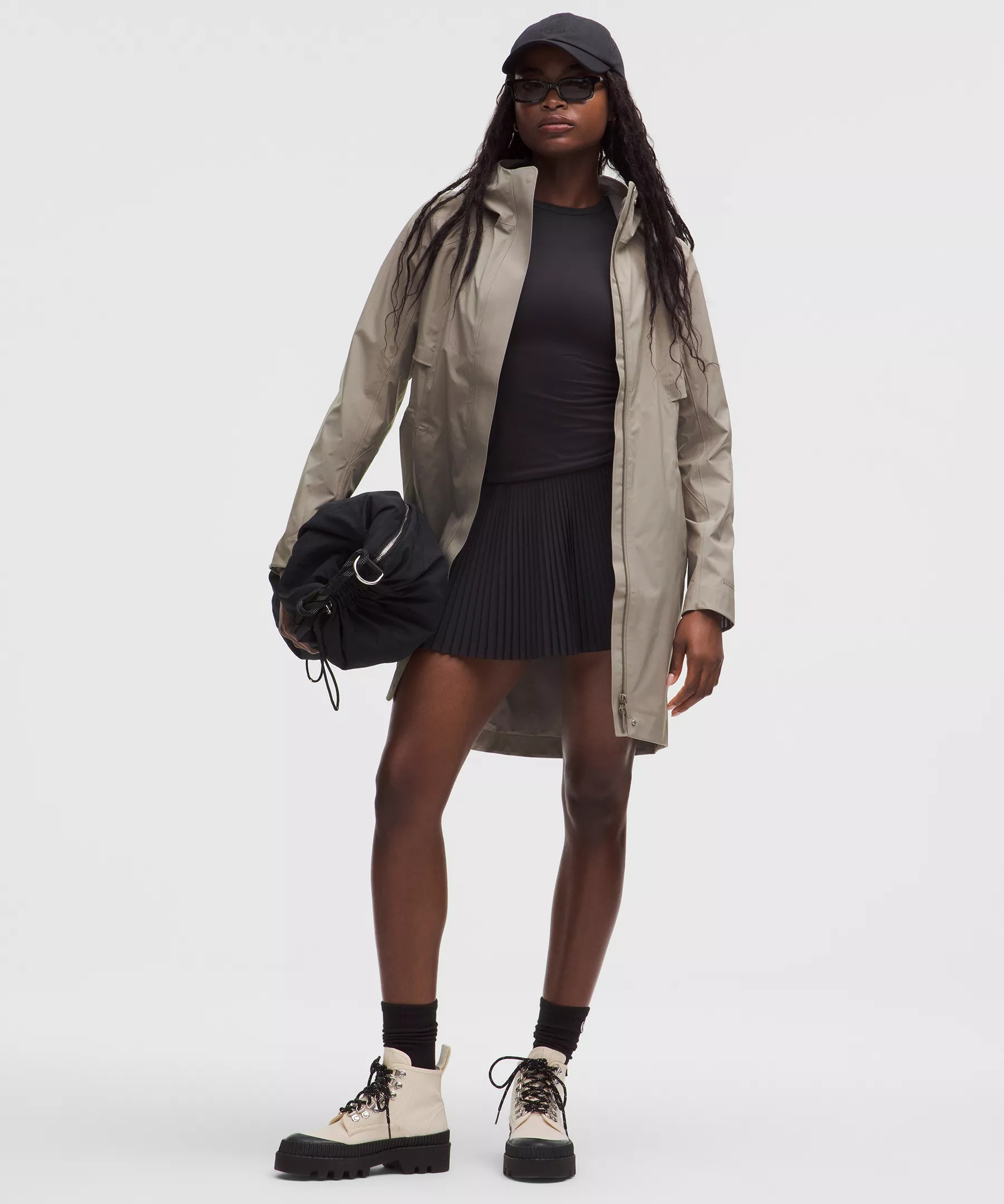 Designed for Casual Waterproof, Glyde™ Fabric - Waterproof - Windproof - Breathable - Seam-sealed to keep you dry Classic Fit, Thigh Length - Classic fit falls away from your body with room for layering Product Features - Back vent strategically placed to provide airflow - Cinchable waist with a slim slide-and-lock toggle - Cinchable hood - Zippered hand pockets with hidden phone sleeve - Two zippered chest pockets on the inside - Flip up the cuffs to reveal reflective details - Two-way zipper Material and care Materials Pocket Lining: 100% Recycled Polyester - Body: Face: 100% Recycled PolyesterMiddle: 100% PolyurethaneBack: 100% Polyester - Lining: 100% Recycled Polyester - Mesh: 90% Recycled Polyester10% Lycra Elastane Care Machine Wash Cold - Do Not Bleach - Tumble Dry Low - Do Not Iron - Do Not Dry Clean - Wash With Like Colors
