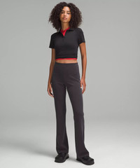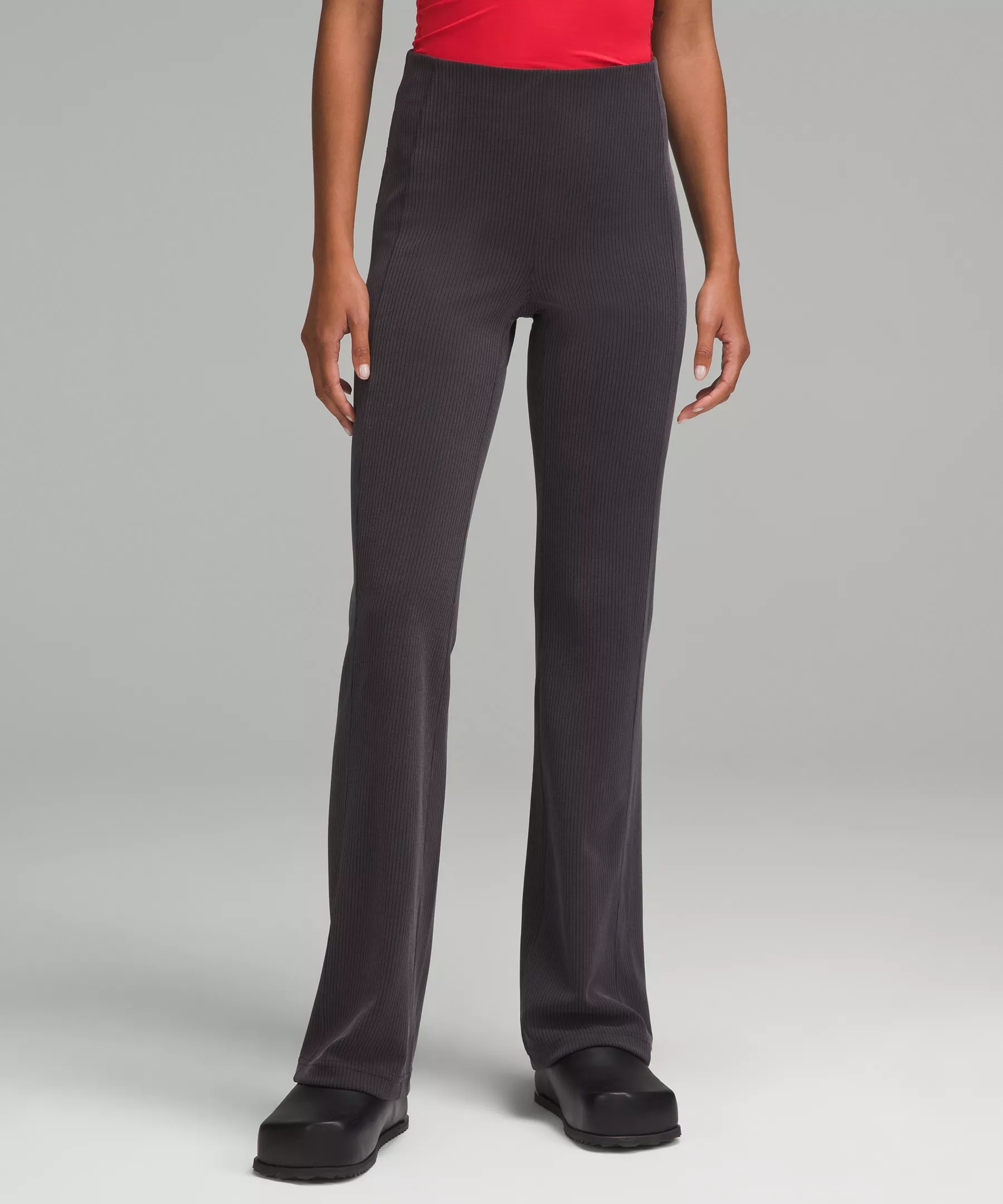 Peach-Fuzz Soft, Ribbed Softstreme™ Fabric Peach-fuzz soft, ribbed texture Smooth surface next to skin Quick-drying Machine washable. Water drops can easily mark this fabric—a simple wash will remove them 100% of the polyester in this product is recycled (excluding trims) Fabric is derived from responsibly sourced wood-based materials that support the protection of ancient and endangered forests High Rise, Full Length Flares out from the knee to hem 33" inseam, intended to skim the floor for heights of 5'5"-5'8" Product Features Back drop-in pocket Wide, ribbed internal waistband is soft next to skin, stays put, and creates a sleek look Material and care Materials Body: 67% Recycled polyester28% Lenzing® modal5% Elastane Care Wash separately Machine wash cold gentle Do not bleach Lay flat to dry Do not iron Do not dry clean Imported
