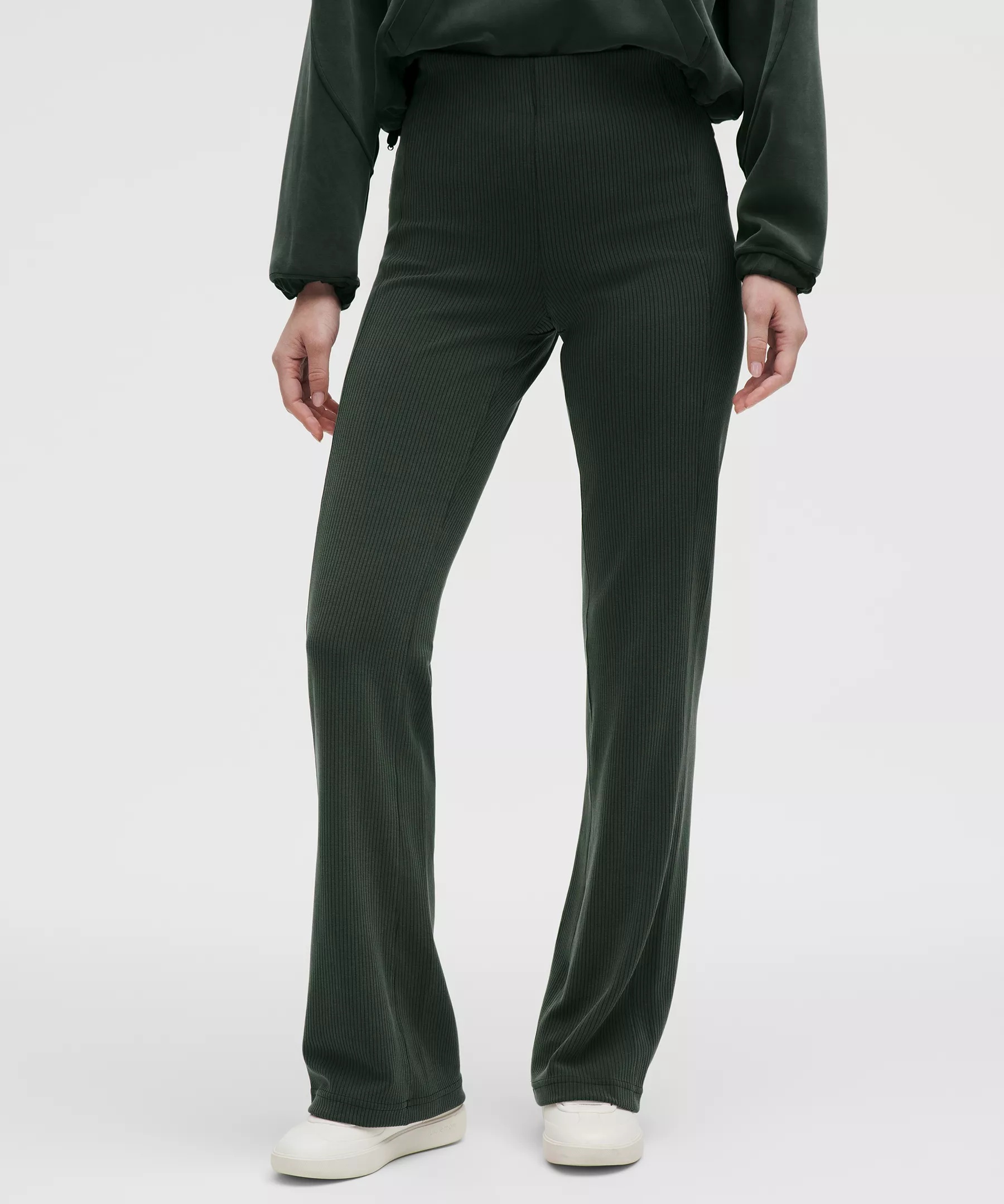 Peach-Fuzz Soft, Ribbed Softstreme™ Fabric Peach-fuzz soft, ribbed texture Smooth surface next to skin Quick-drying Machine washable. Water drops can easily mark this fabric—a simple wash will remove them 100% of the polyester in this product is recycled (excluding trims) Fabric is derived from responsibly sourced wood-based materials that support the protection of ancient and endangered forests High Rise, Full Length Flares out from the knee to hem 33" inseam, intended to skim the floor for heights of 5'5"-5'8" Product Features Back drop-in pocket Wide, ribbed internal waistband is soft next to skin, stays put, and creates a sleek look Material and care Materials Body: 67% Recycled Polyester28% Lenzing Modal5% Elastane Care Wash separately Machine wash cold gentle Do not bleach Lay flat to dry Do not iron Do not dry clean Imported
