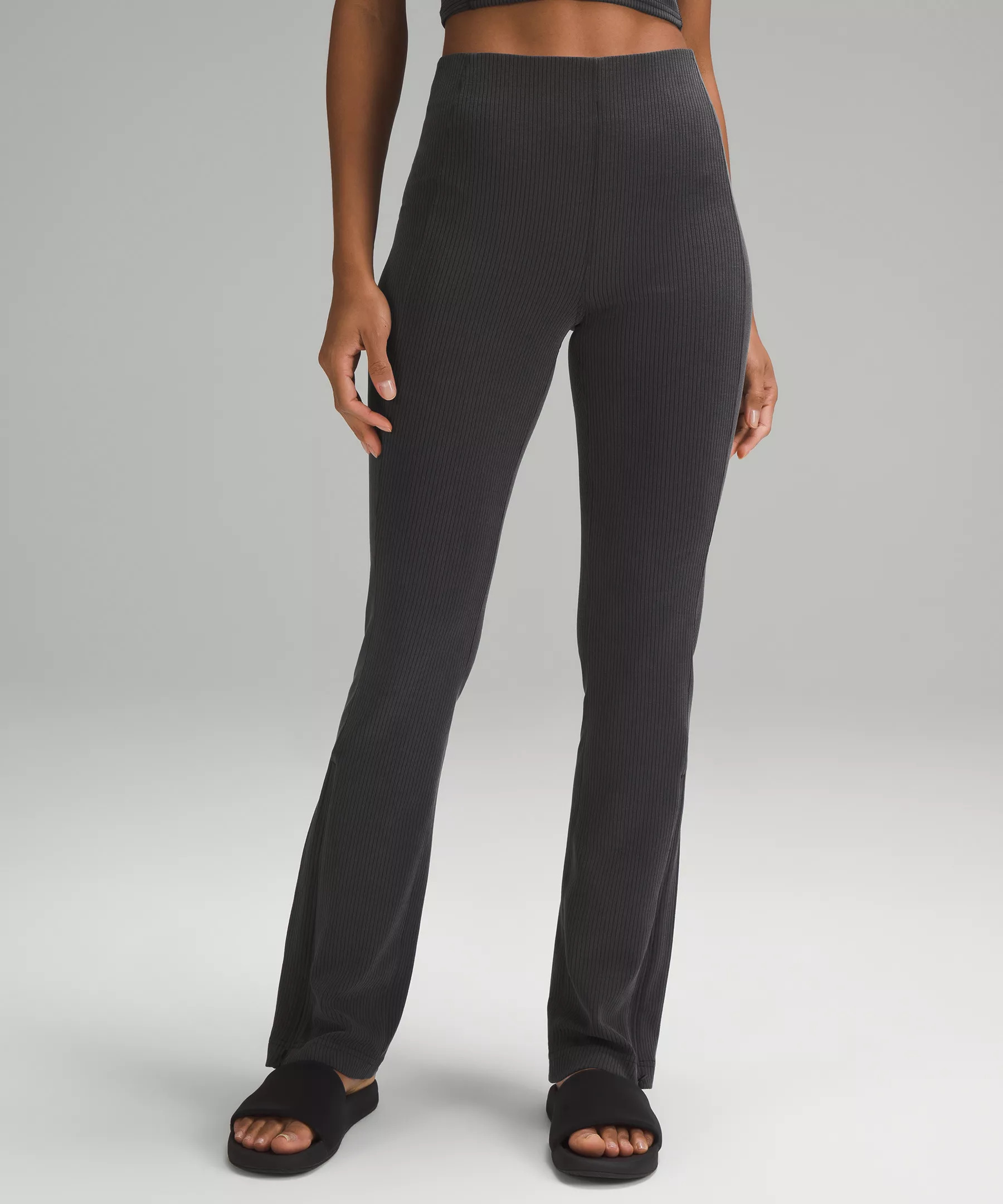 Designed for Casual Peach-Fuzz Soft, Ribbed Softstreme™ Fabric - Peach-fuzz soft - Ribbed texture on the outside - Quick-drying - Machine washable. Water drops can easily mark this fabric—a simple wash will remove them - 100% of the polyester in this product is recycled (excluding trims) High Rise, 31.5" Length - Full length intended to sit just off the ground - Slim fit skims your body - Zippers at the hems let you adjust the look. Open the zippers for a flared leg or close them for a straight leg Product Features - Back drop-in pocket - A wide, interior elasticated ribbed waistband is soft and keeps your pants comfortably in place Material and care Materials Pocket Lining: 82% Nylon18% Lycra Elastane - Body: 67% Recycled Polyester28% Lenzing Modal5% Elastane Care Machine Wash Cold - Do Not Bleach - Tumble Dry Low - Do Not Iron - Do Not Dry Clean